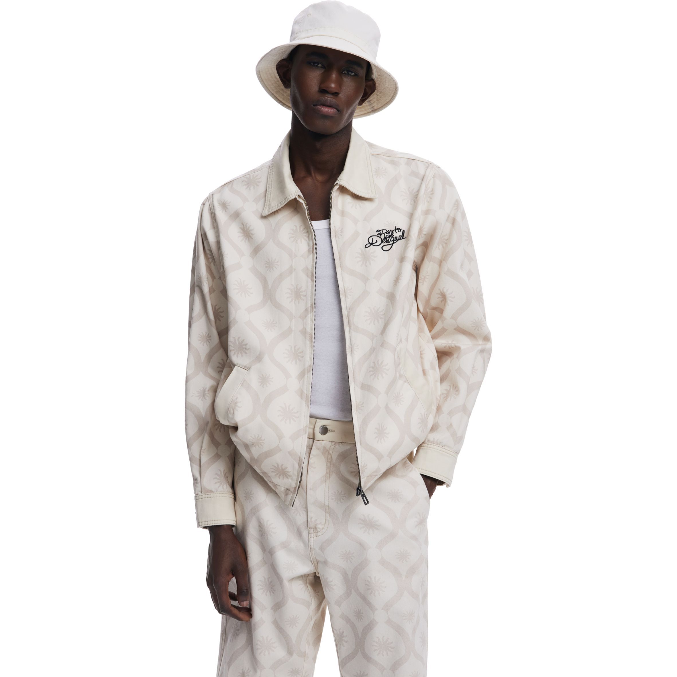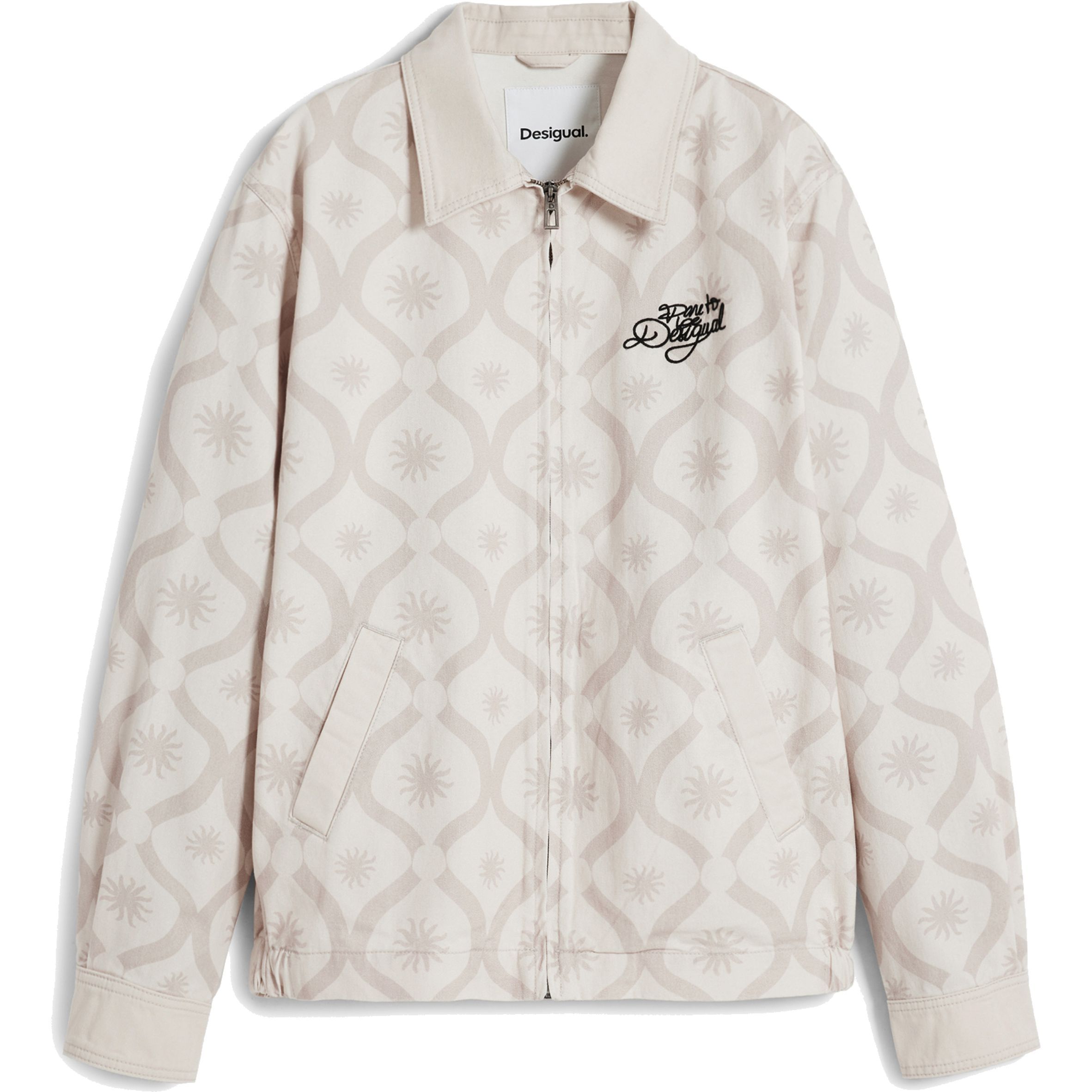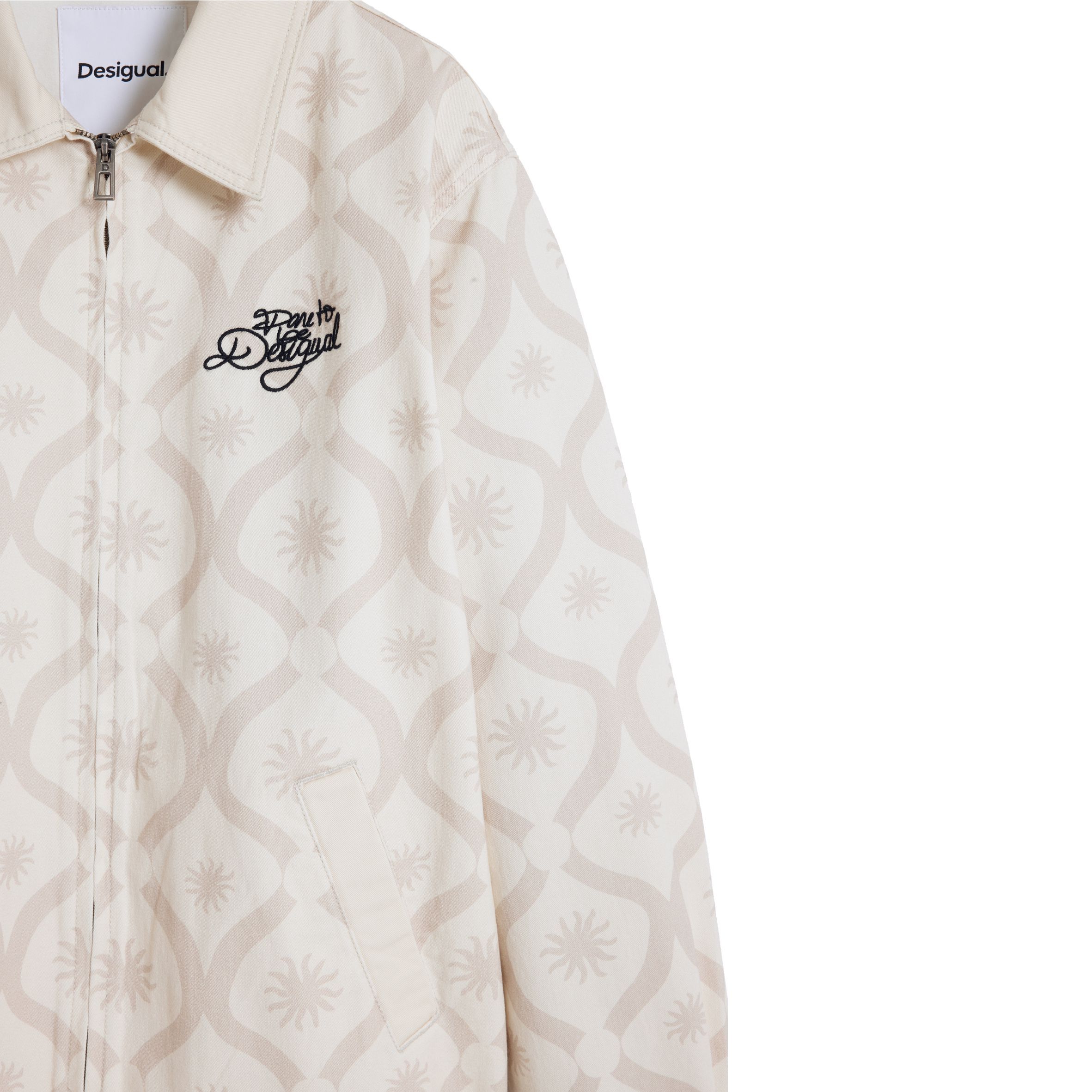 Casual stílusú dzseki alul gumírozott szegéllyel, kontrasztos színű napmintákkal és a "Dare to be Desigual" szöveg hímzéssel az elején.