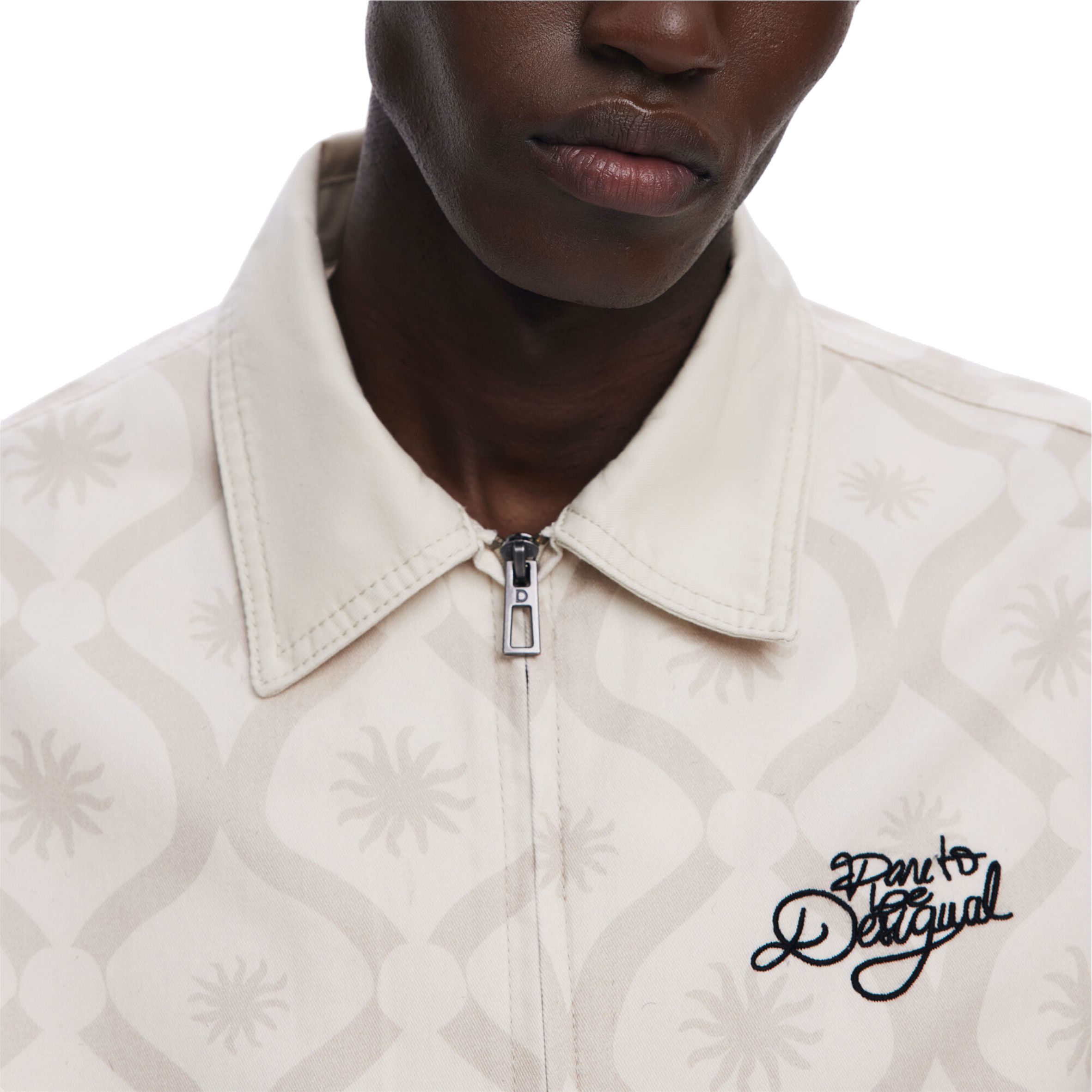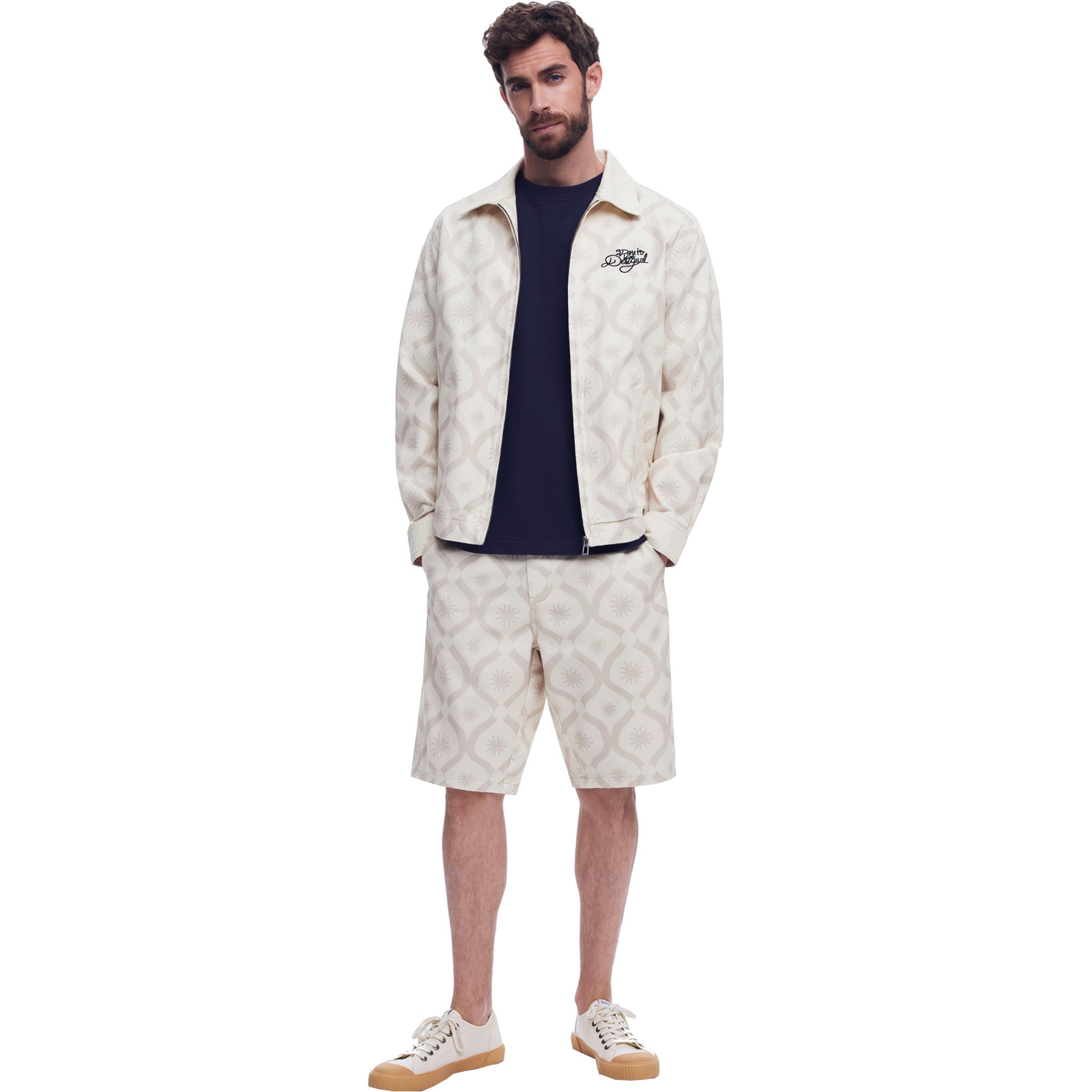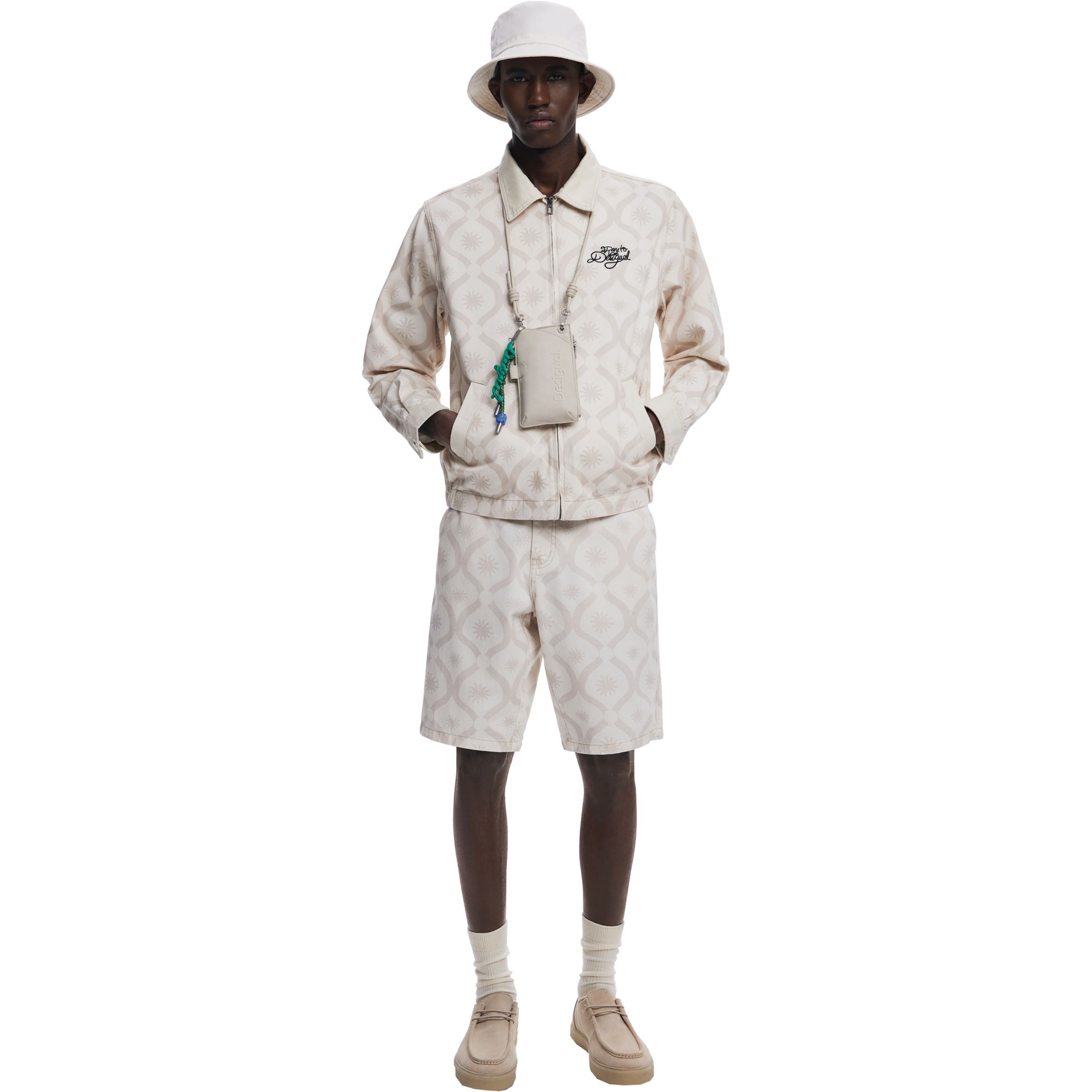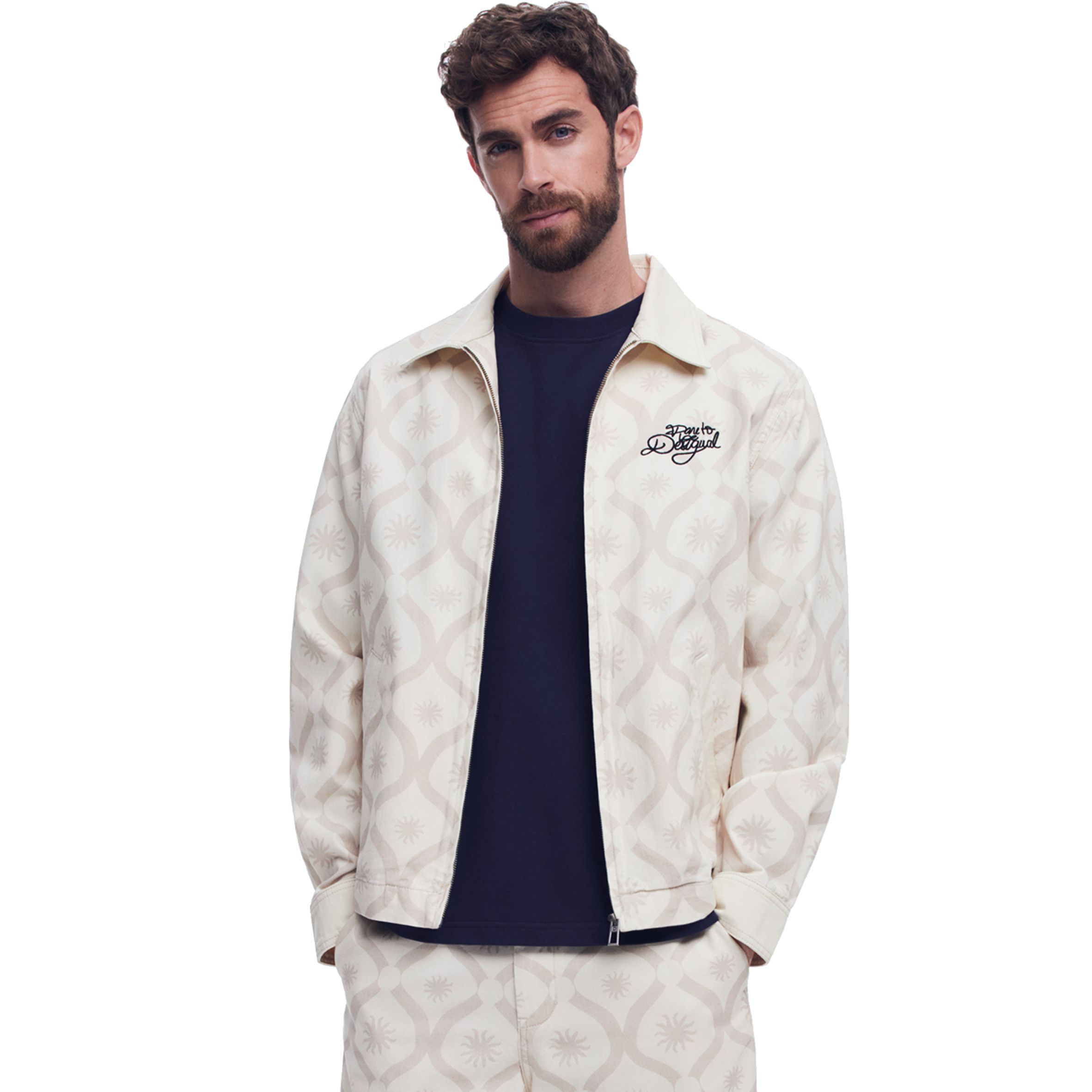 Casual stílusú dzseki alul gumírozott szegéllyel, kontrasztos színű napmintákkal és a "Dare to be Desigual" szöveg hímzéssel az elején.