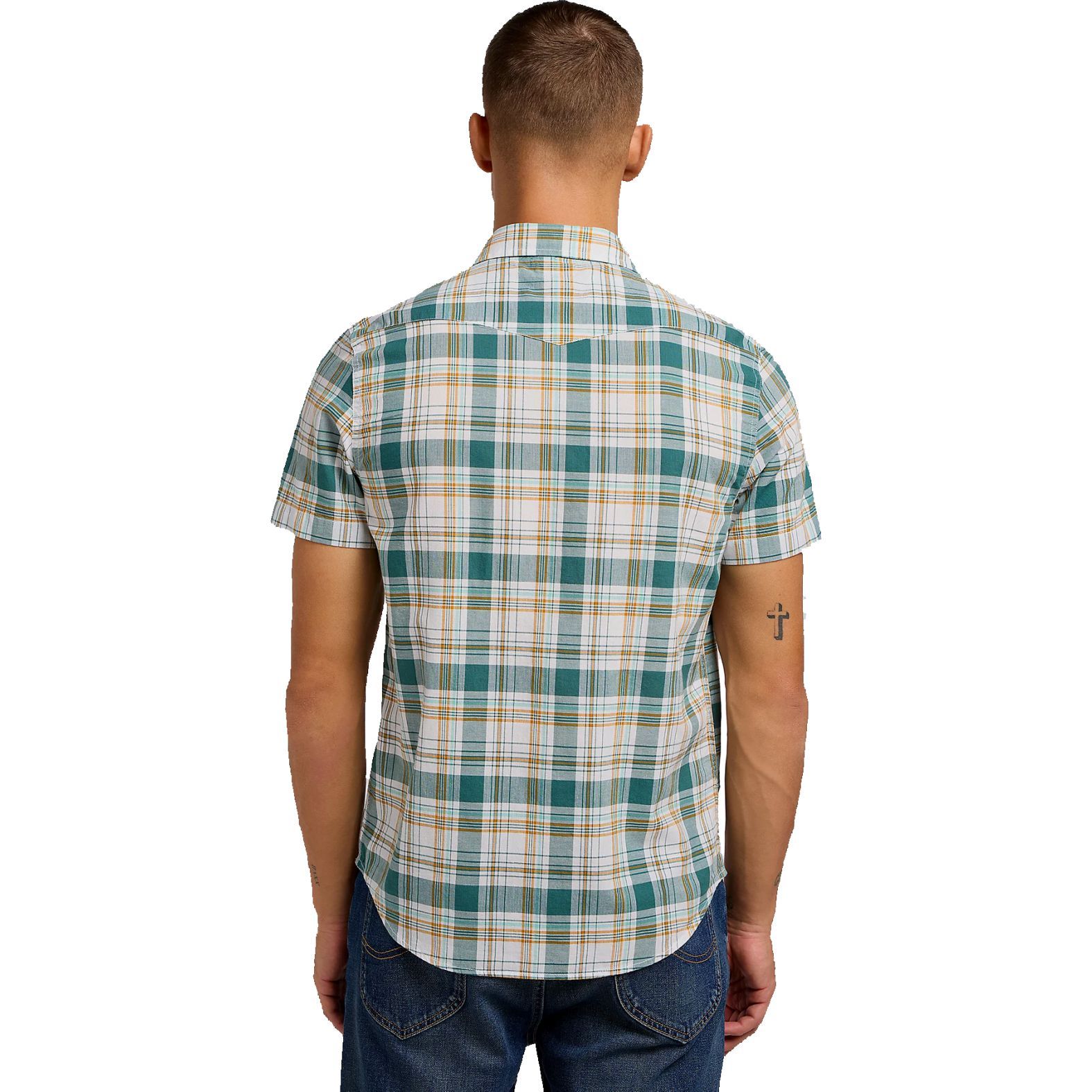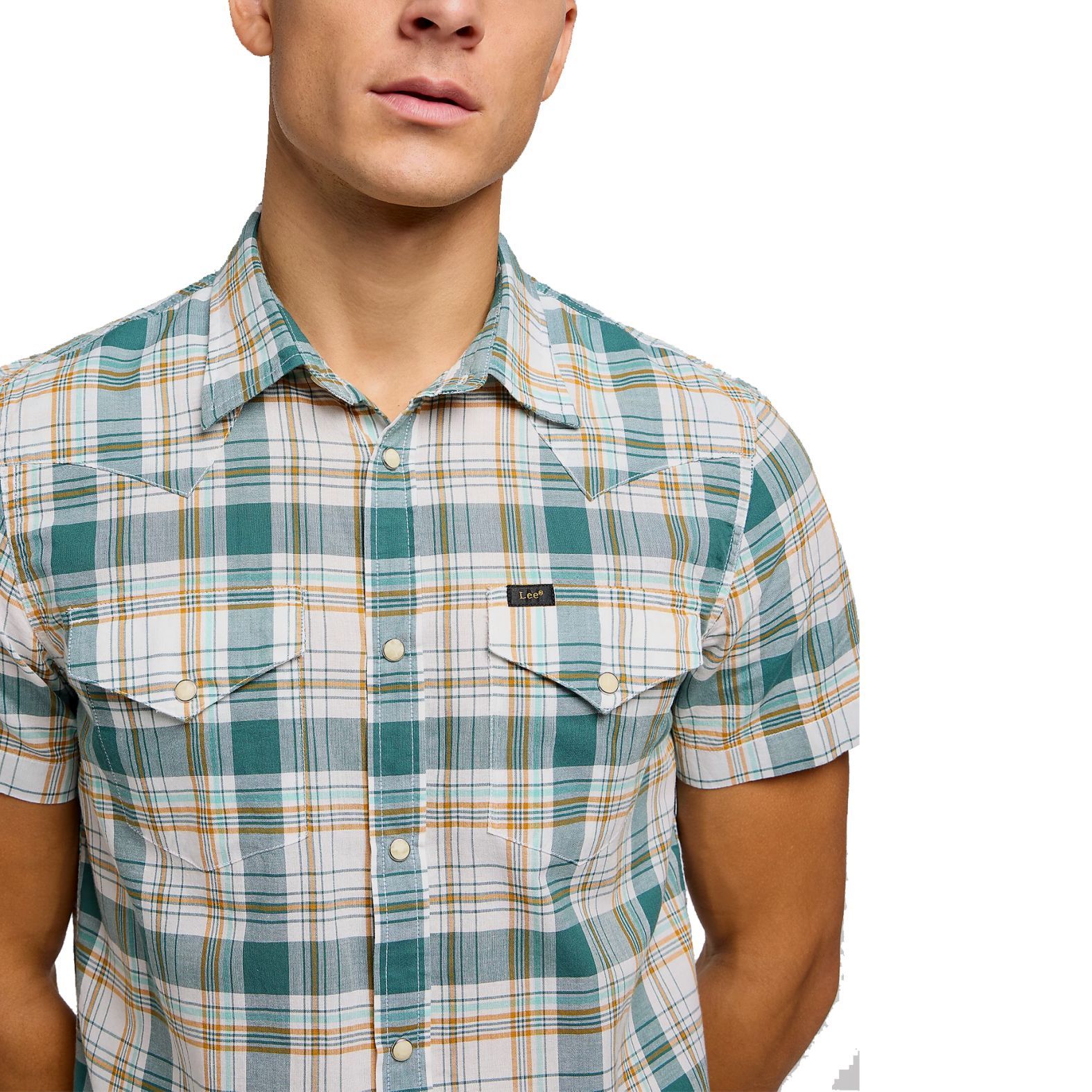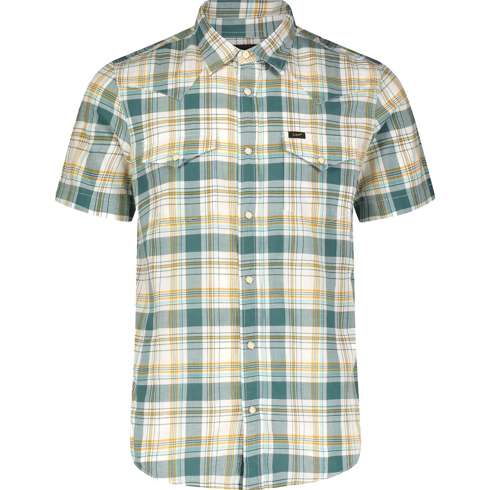 A Lee® SS Western Shirt Evergreen 112349937 egyedi szabásvonalú rövid ujjú ing, az eredetiséget igazoló címkékkel a bal zsebén és a nyak belső részén.