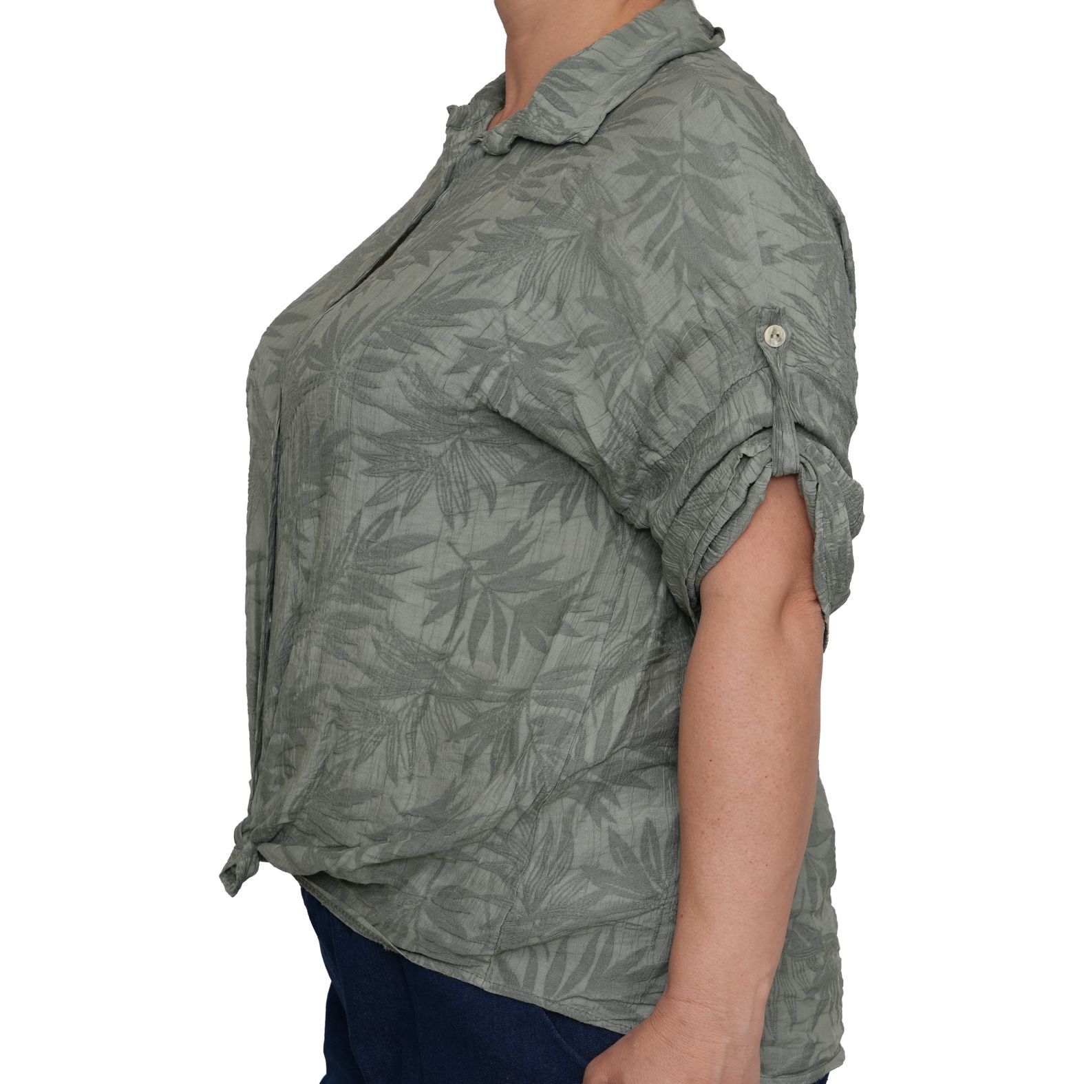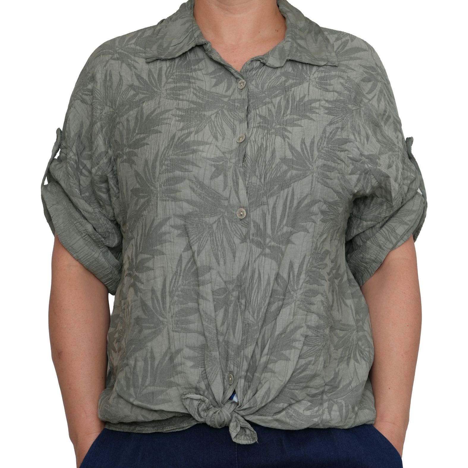 Galléros, gombos kialakítása időtlen és nőies megjelenést ad, míg az elöl megköthető alsó rész játékos, lazább hatást kölcsönöz a felsőnek. Finoman texturált felülete különlegesebb megjelenést teremt az egyszerű szabás mellett is.