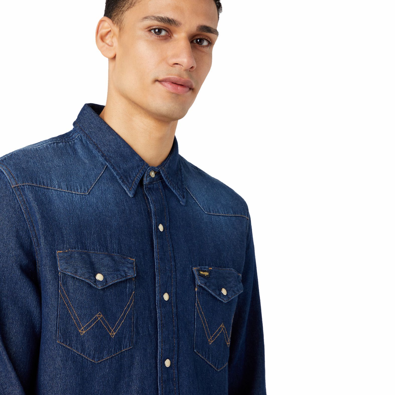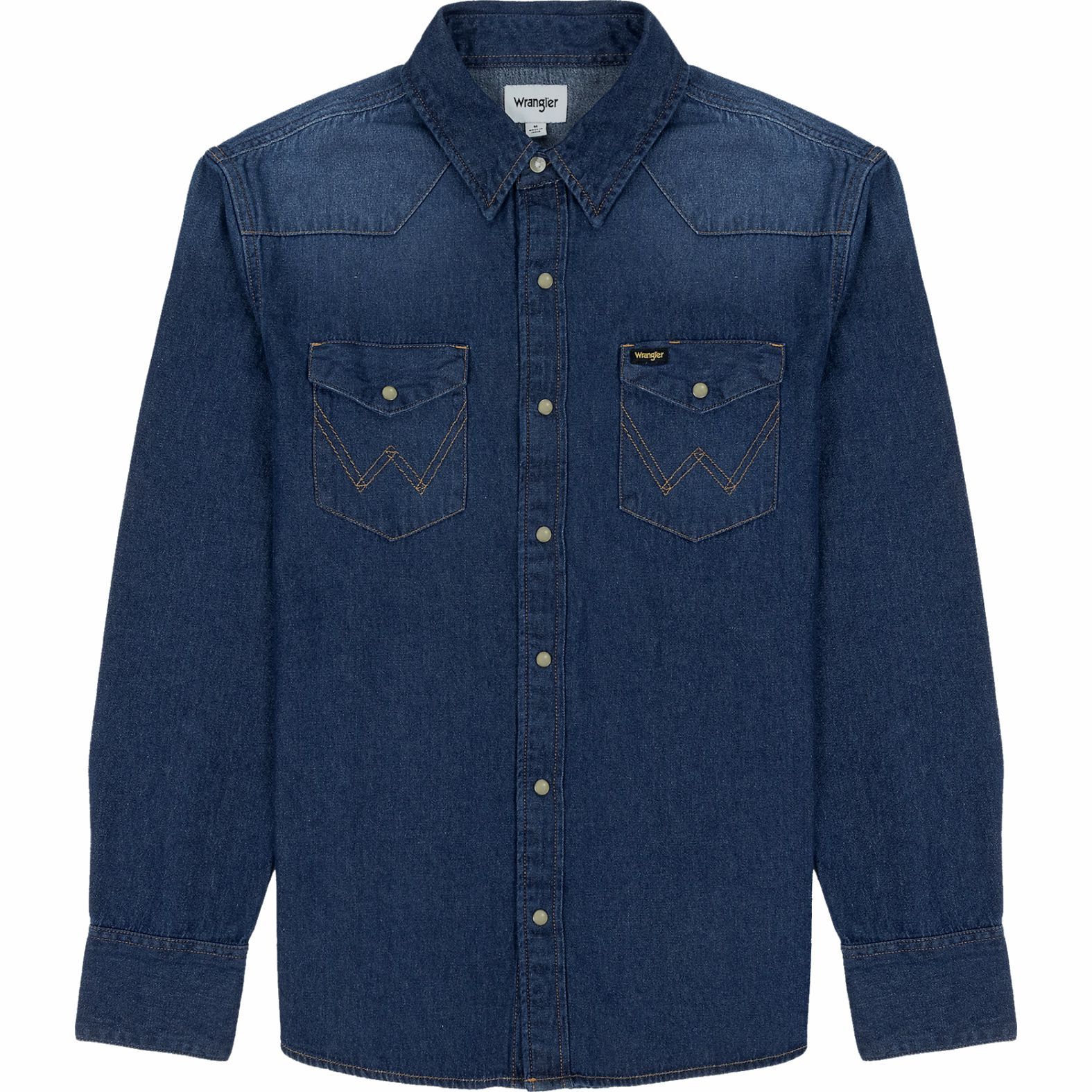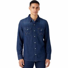 A Wrangler® 27MW Denim Dark Stone 112341088 modellje az időtlen, hagyományos sztreccs nélküli denim farmeralapanyagból készült, sötétkék vintázs eljárással. Olyan autentikus részletekkel találkozhatsz, mint a western vállbetét, hegyes gallér és nyakánál gombos, egyébként gyöngyház patentos záródás.