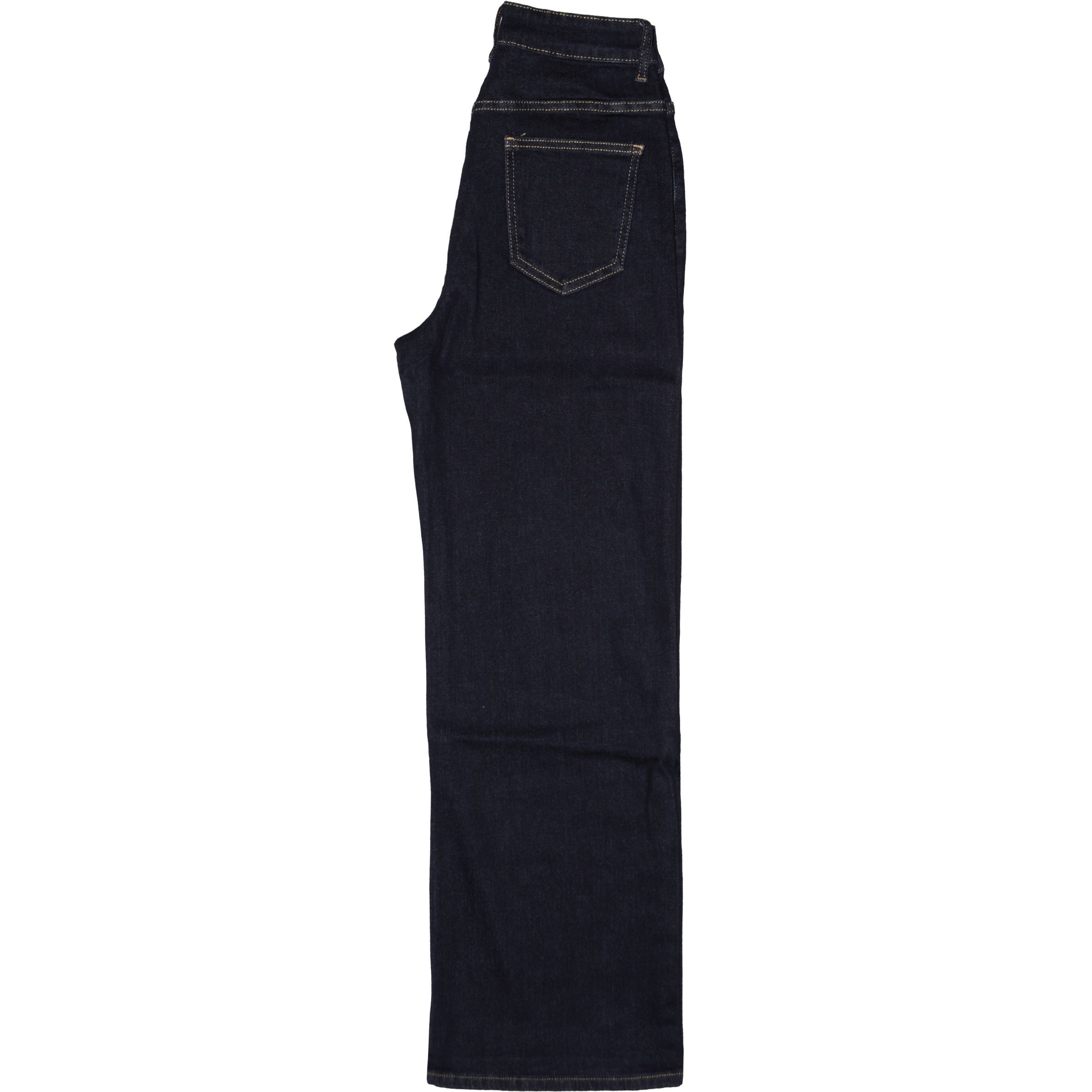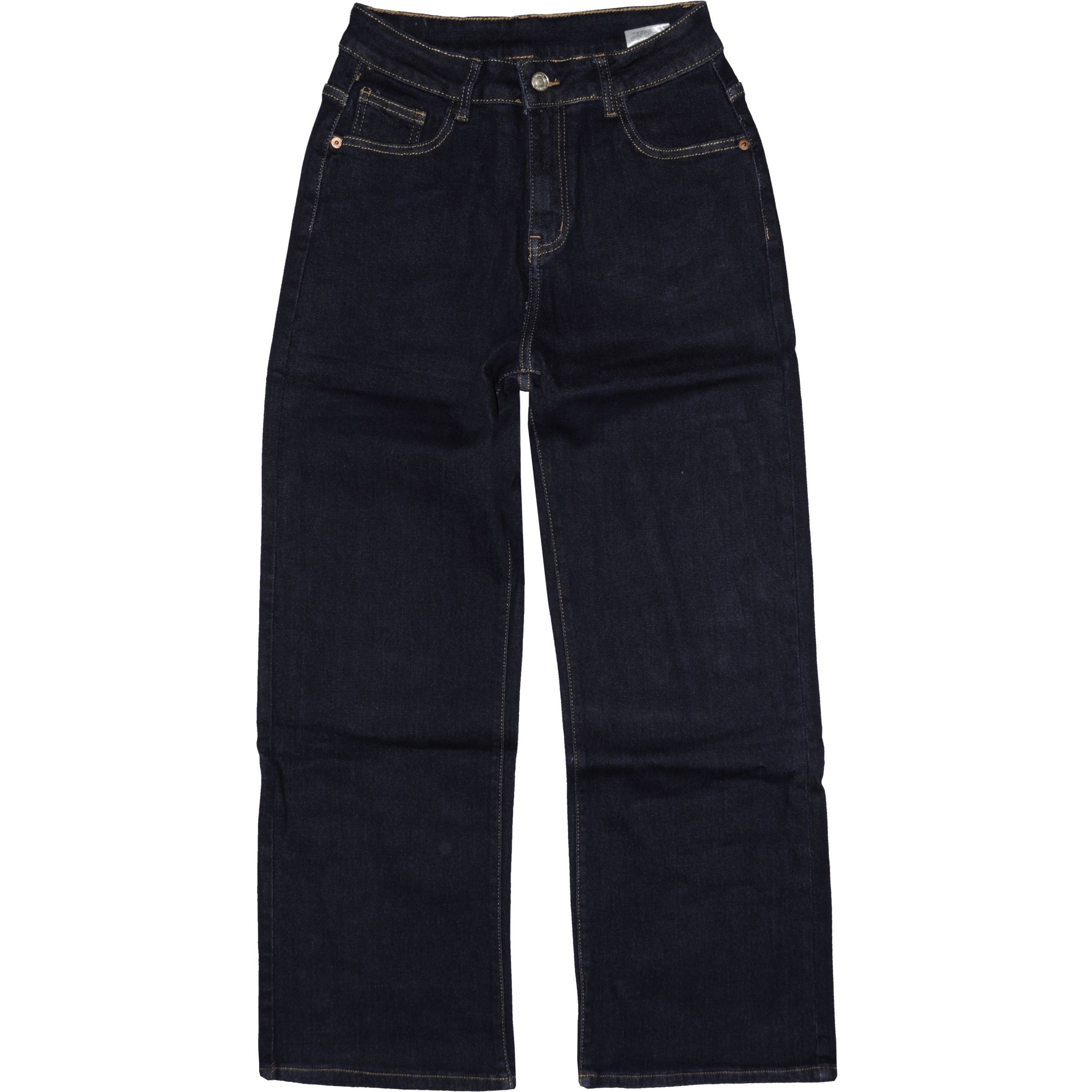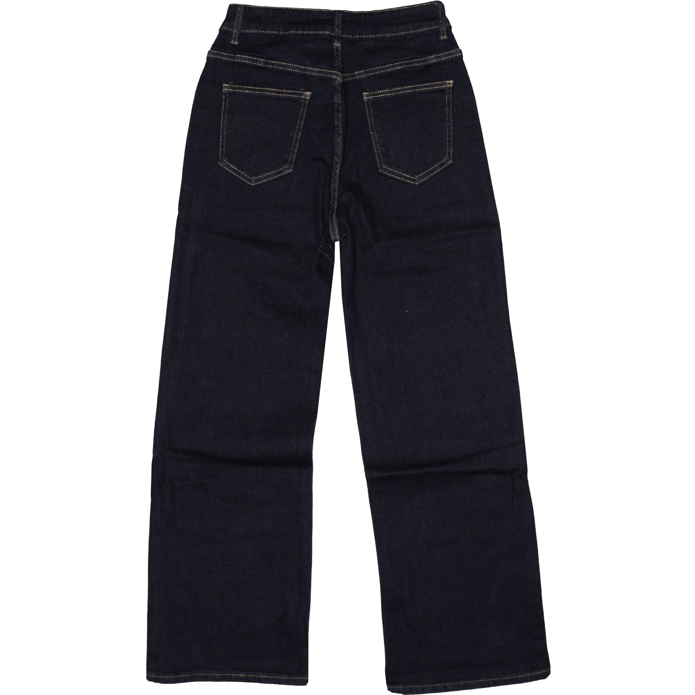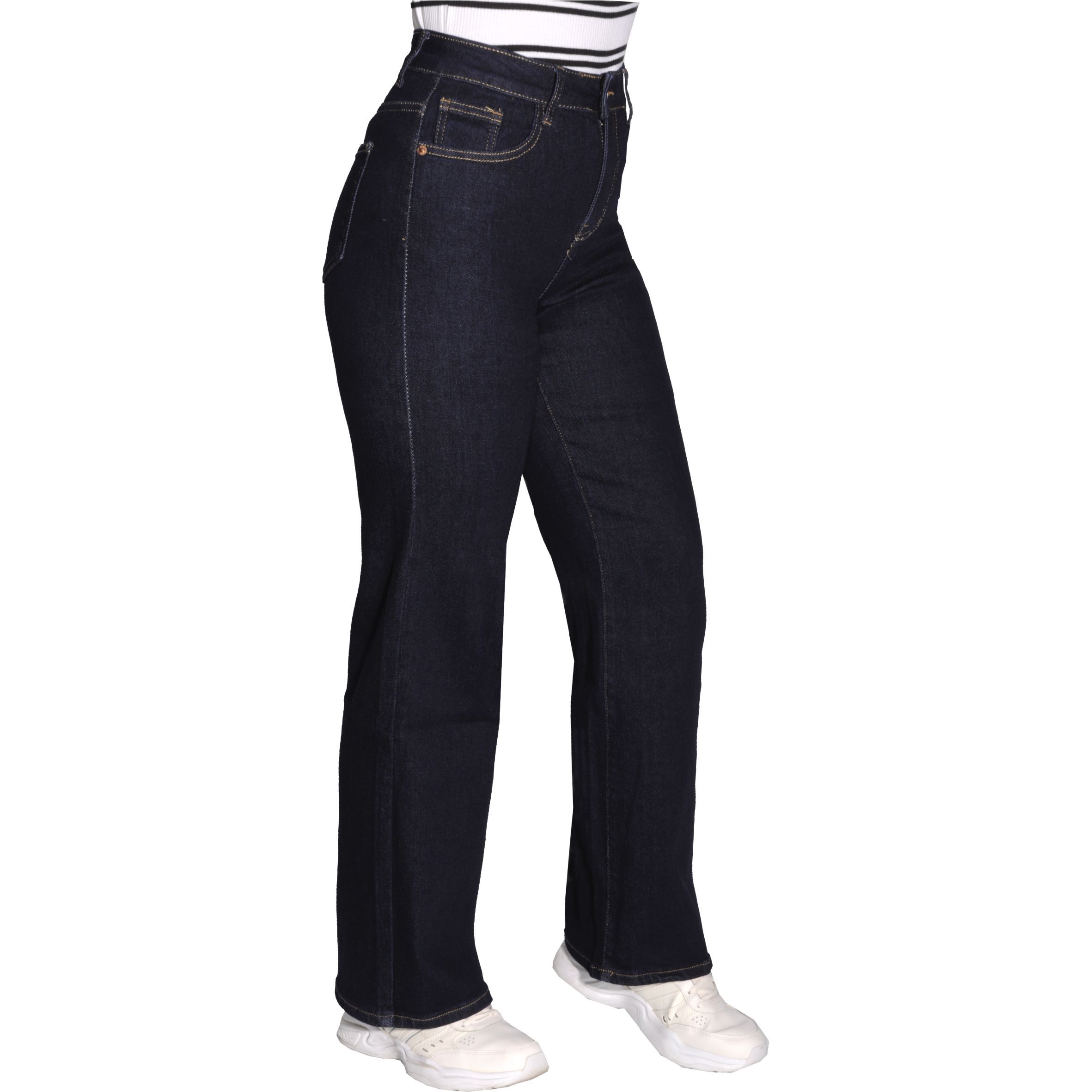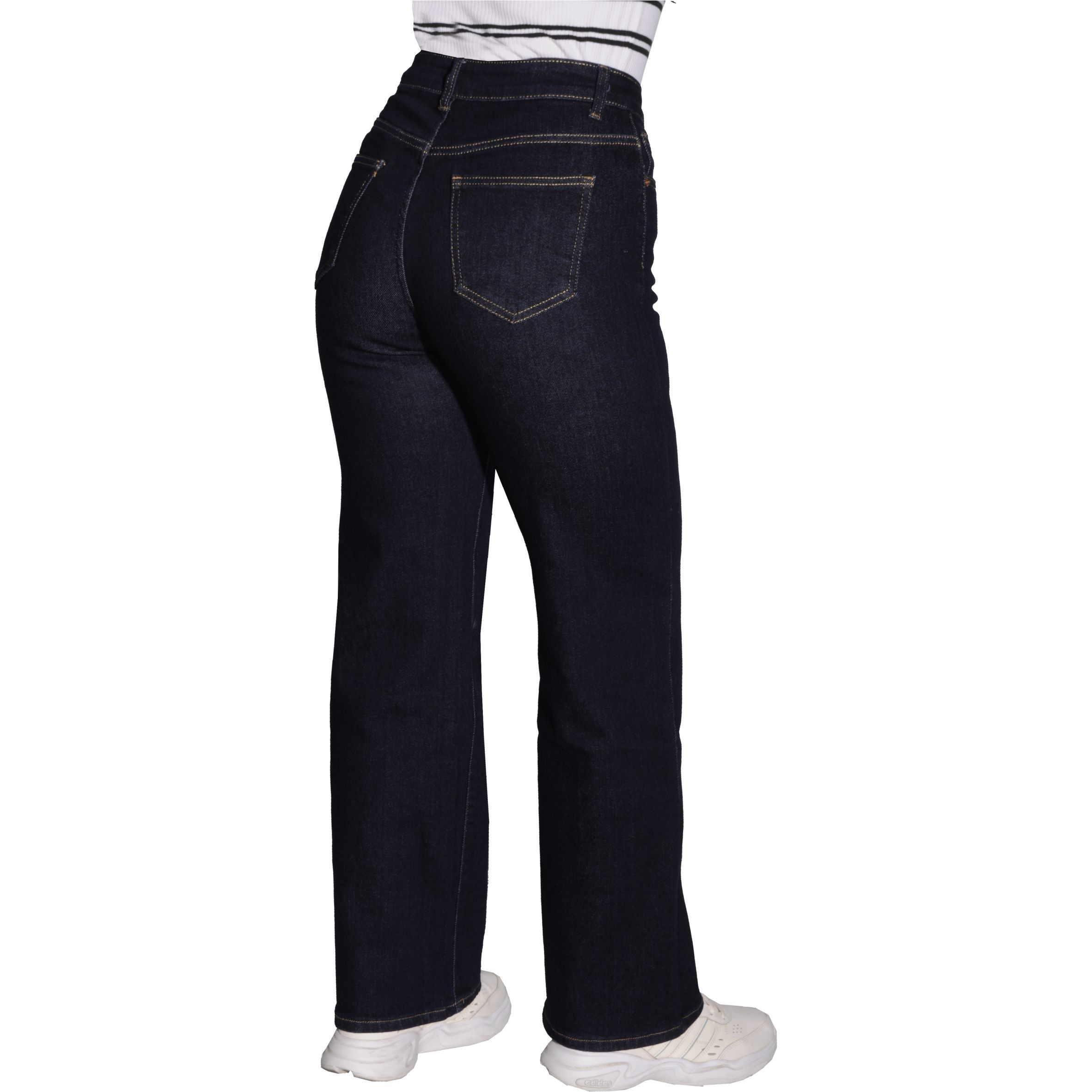 Bő szárú, trapéz koptatás nélküli sötétkék színű női farmernadrág.