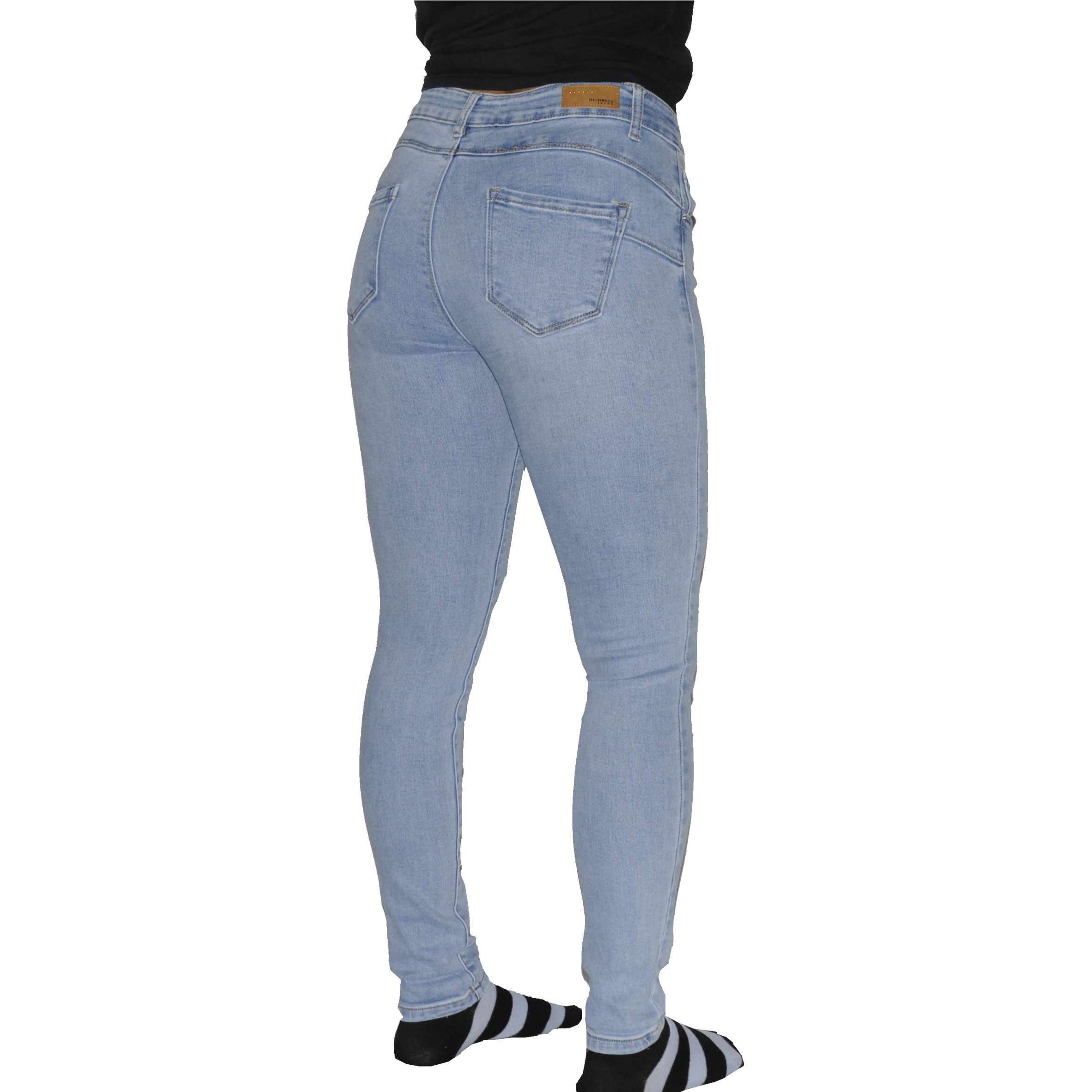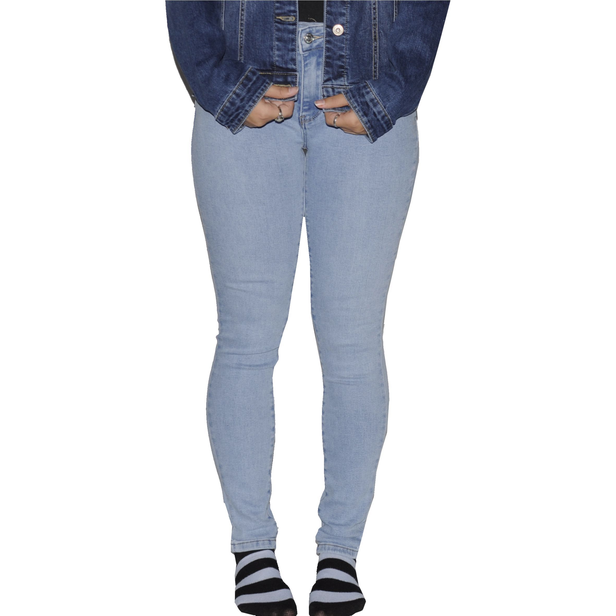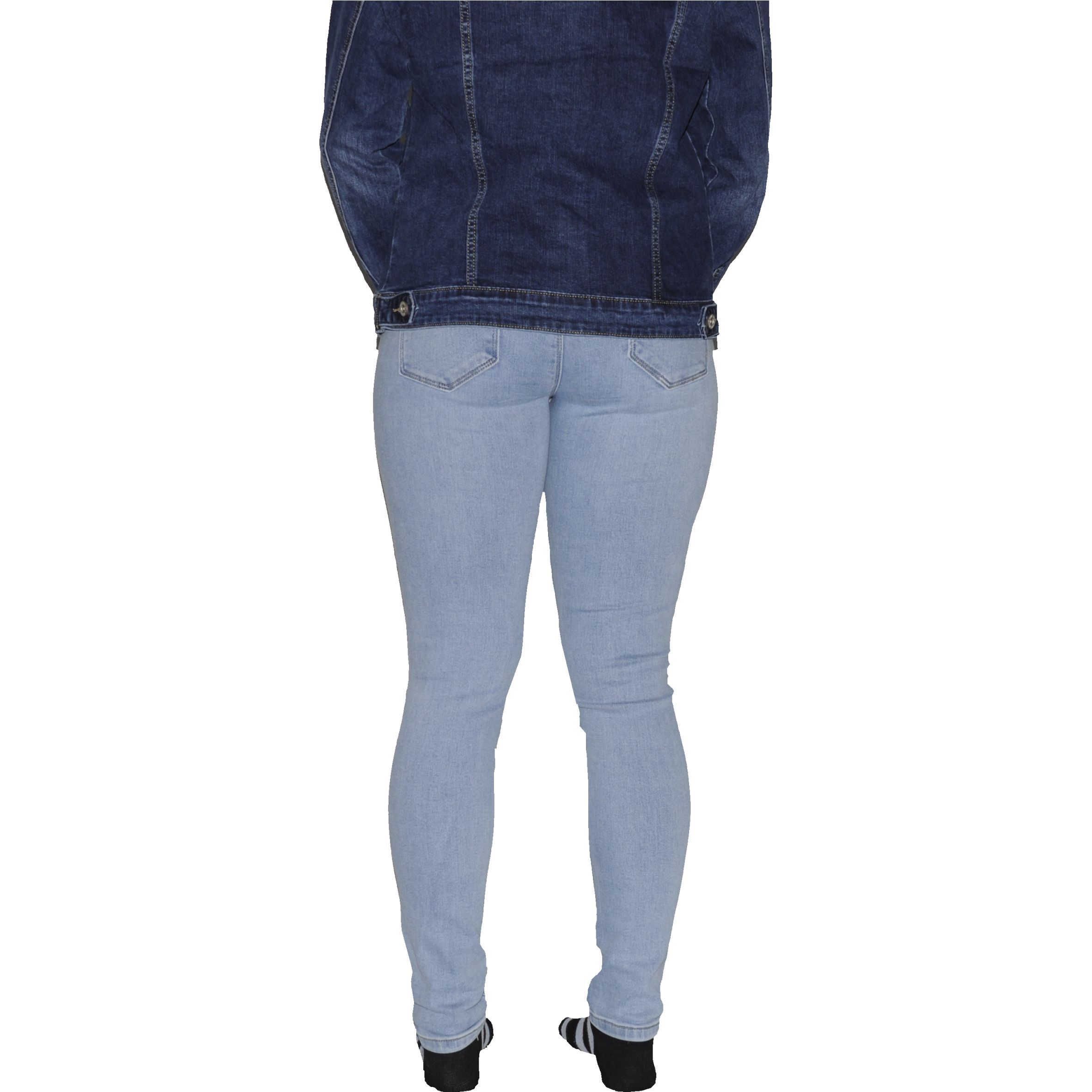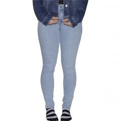 Világoskék színű, koptatás nélküli szűk szárú női farmernadrág.