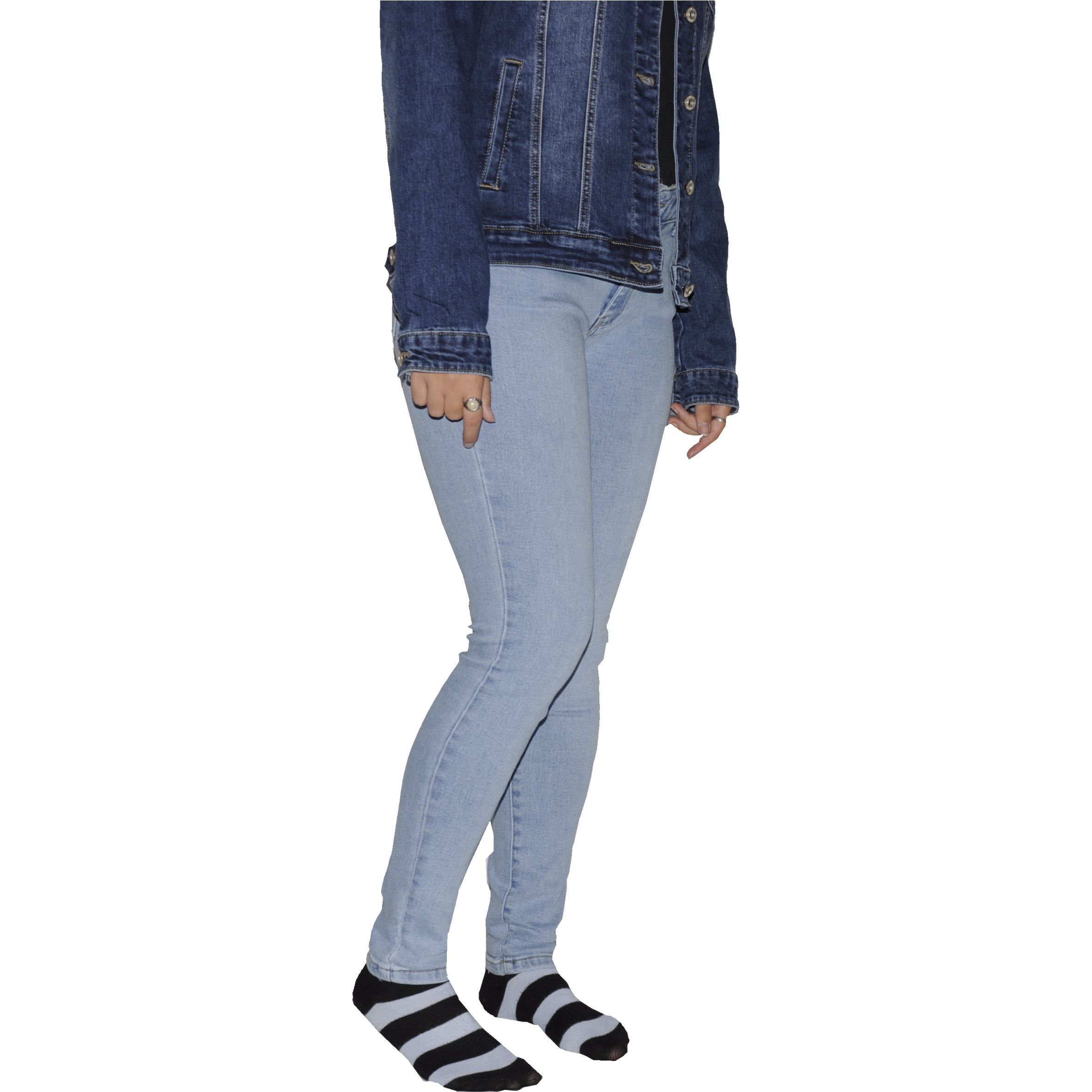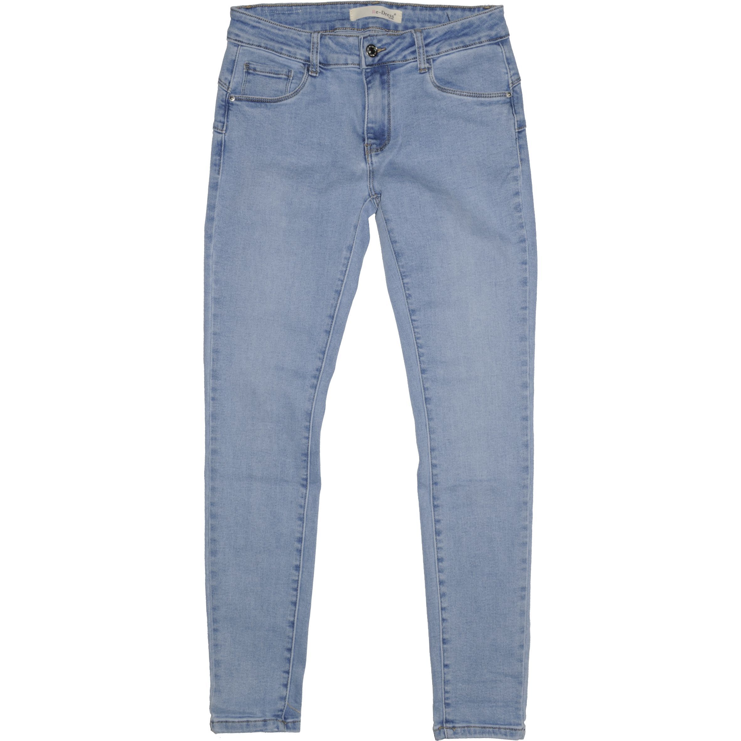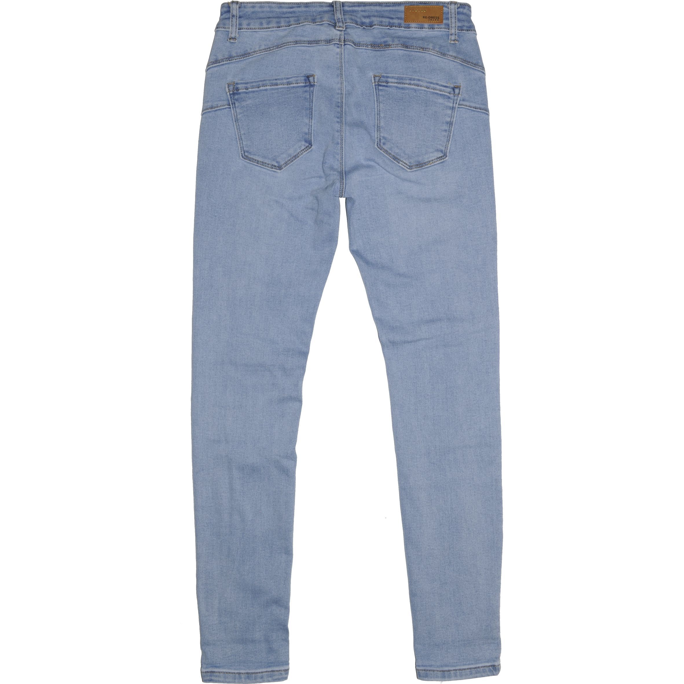 Világoskék színű, koptatás nélküli szűk szárú női farmernadrág.
