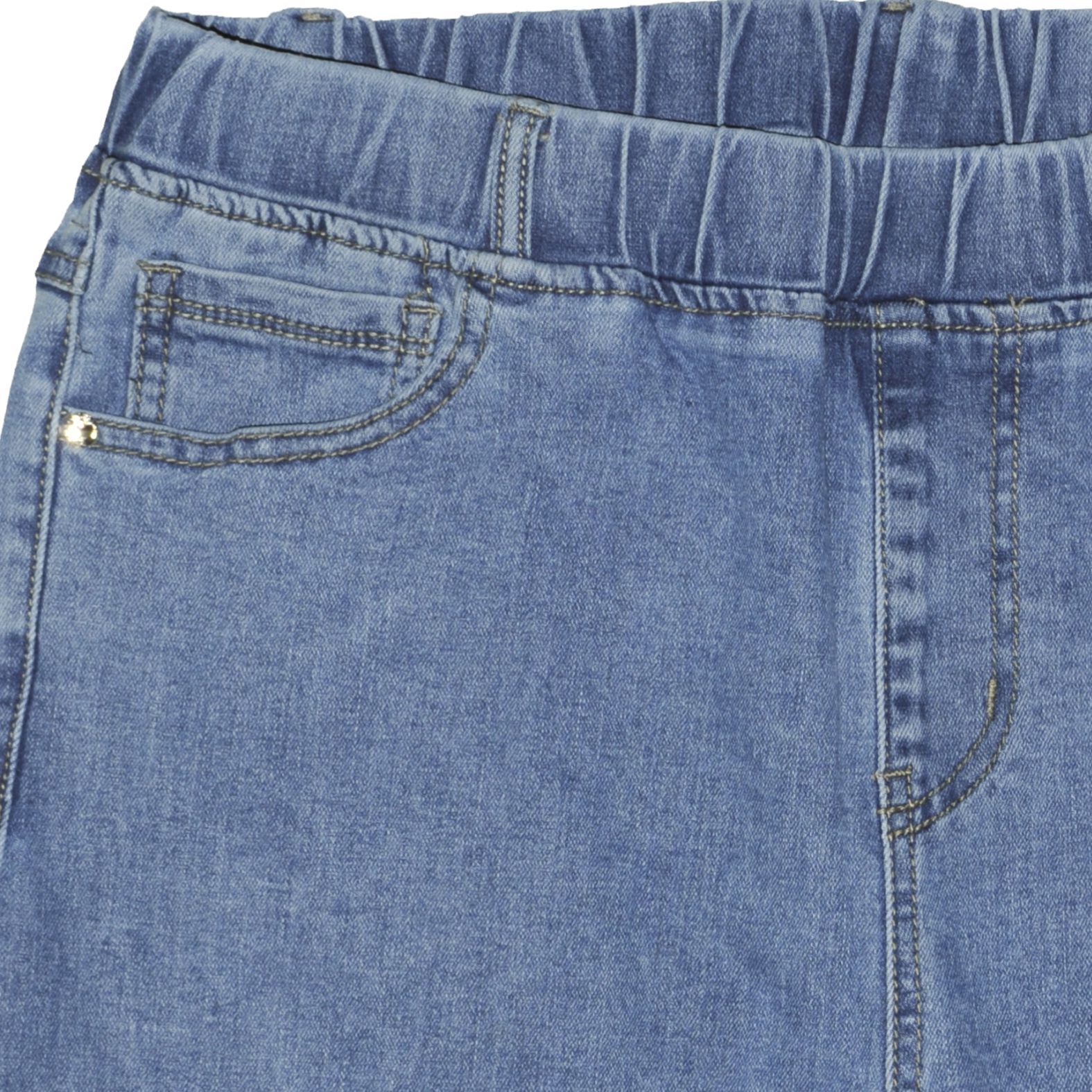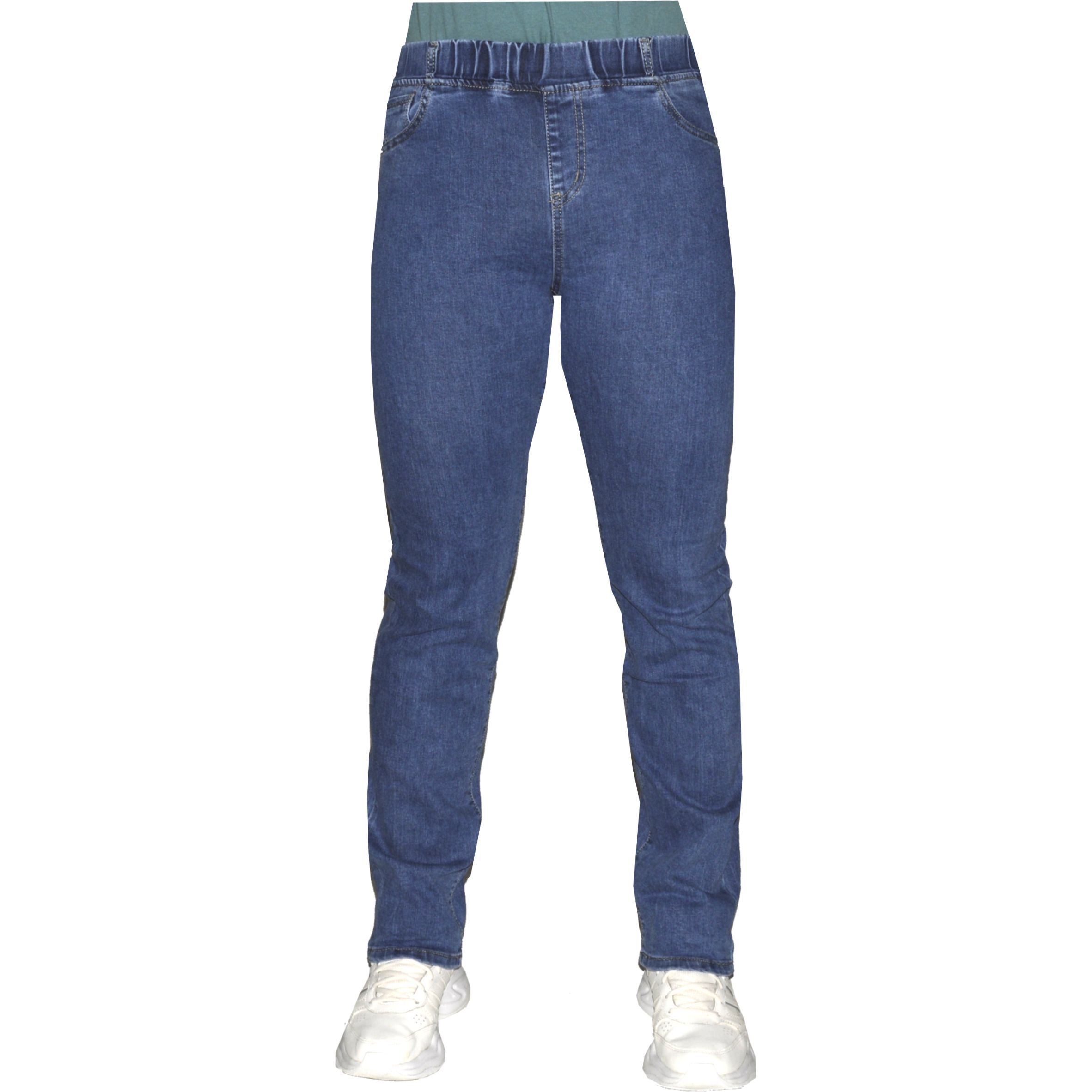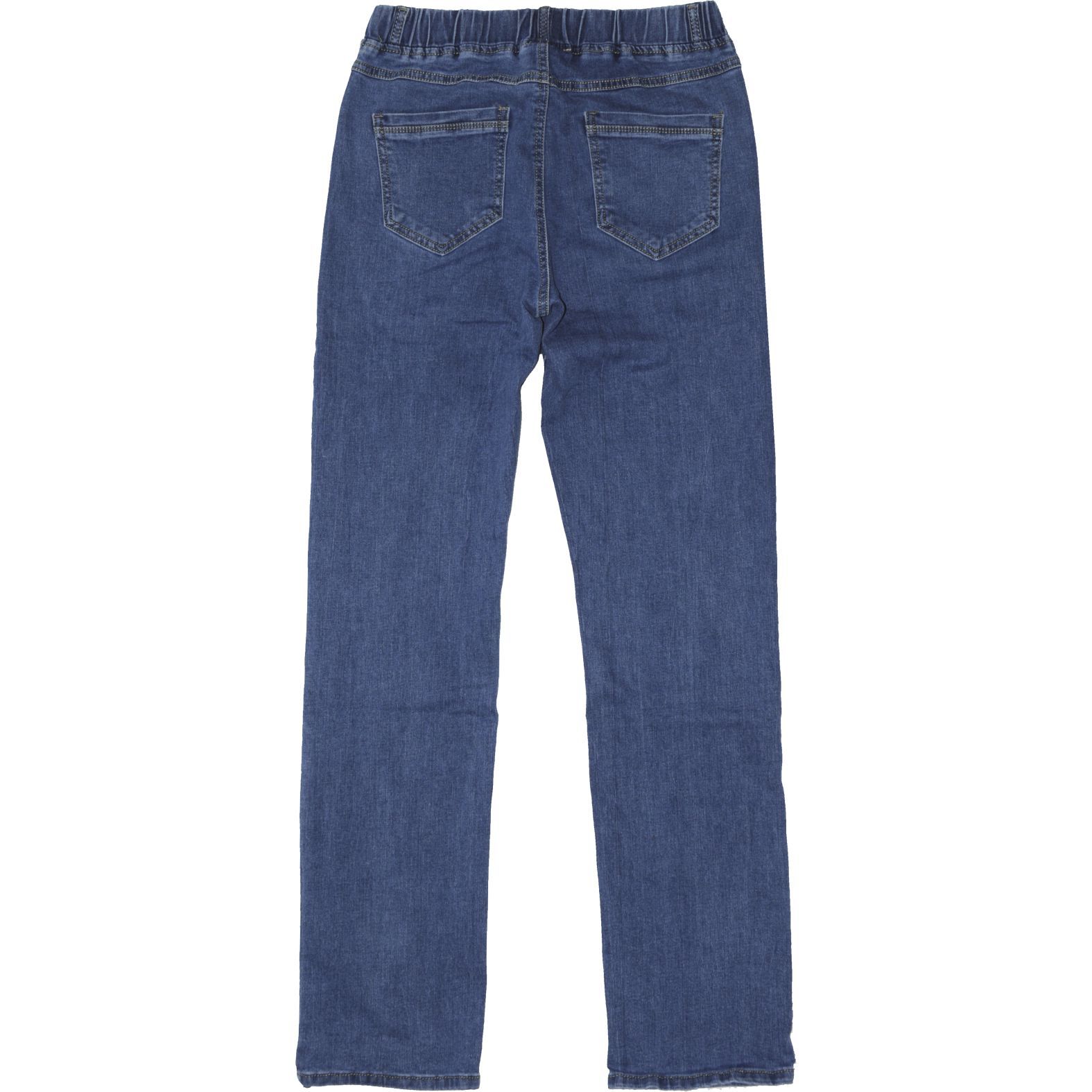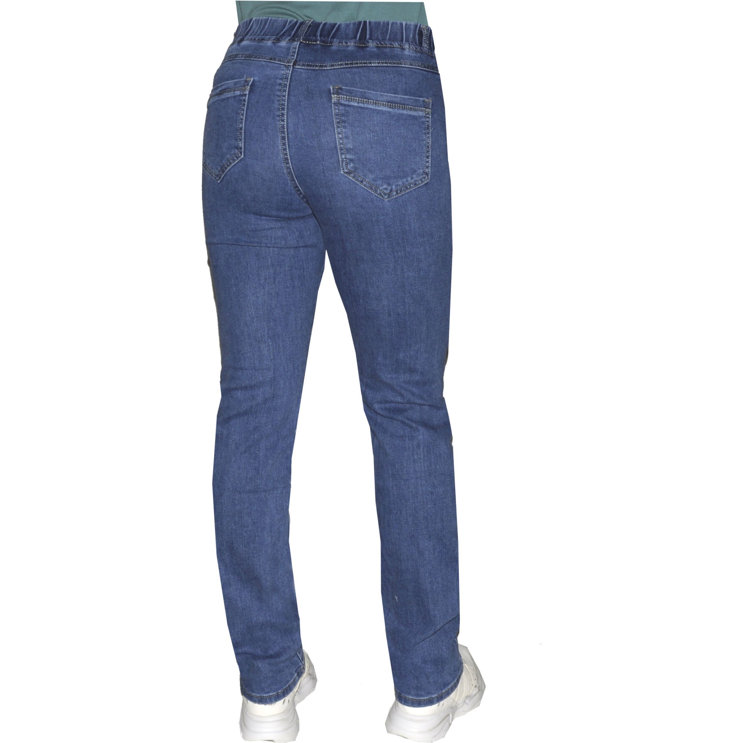 Hagyományos egyenes szárú gumis derekú női farmernadrág.