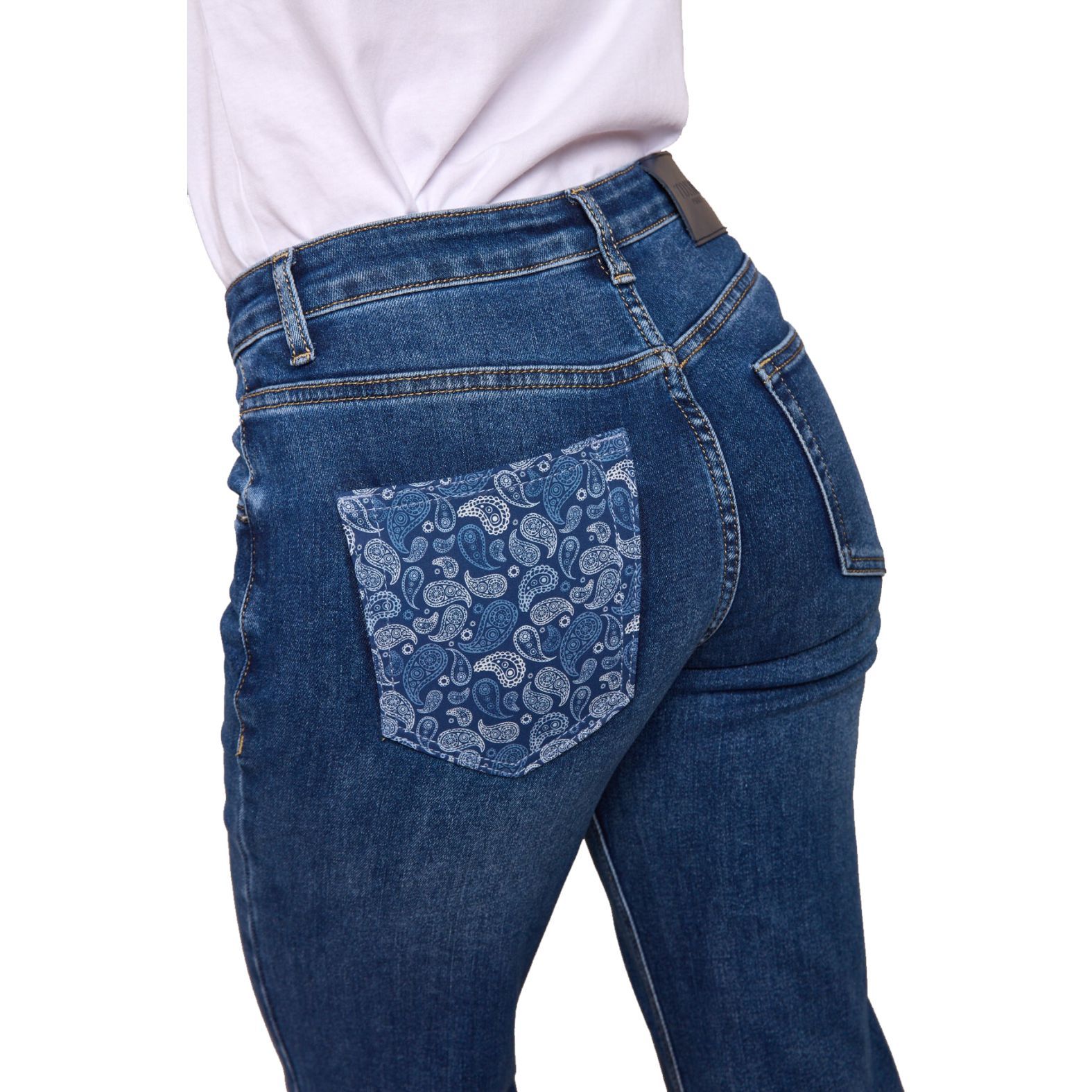 Bal hátsó zsebén és a jobb első bújtatóján különleges kasmír mintázattal azok számára, akik értékelik a részleteket és az eredetiséget.