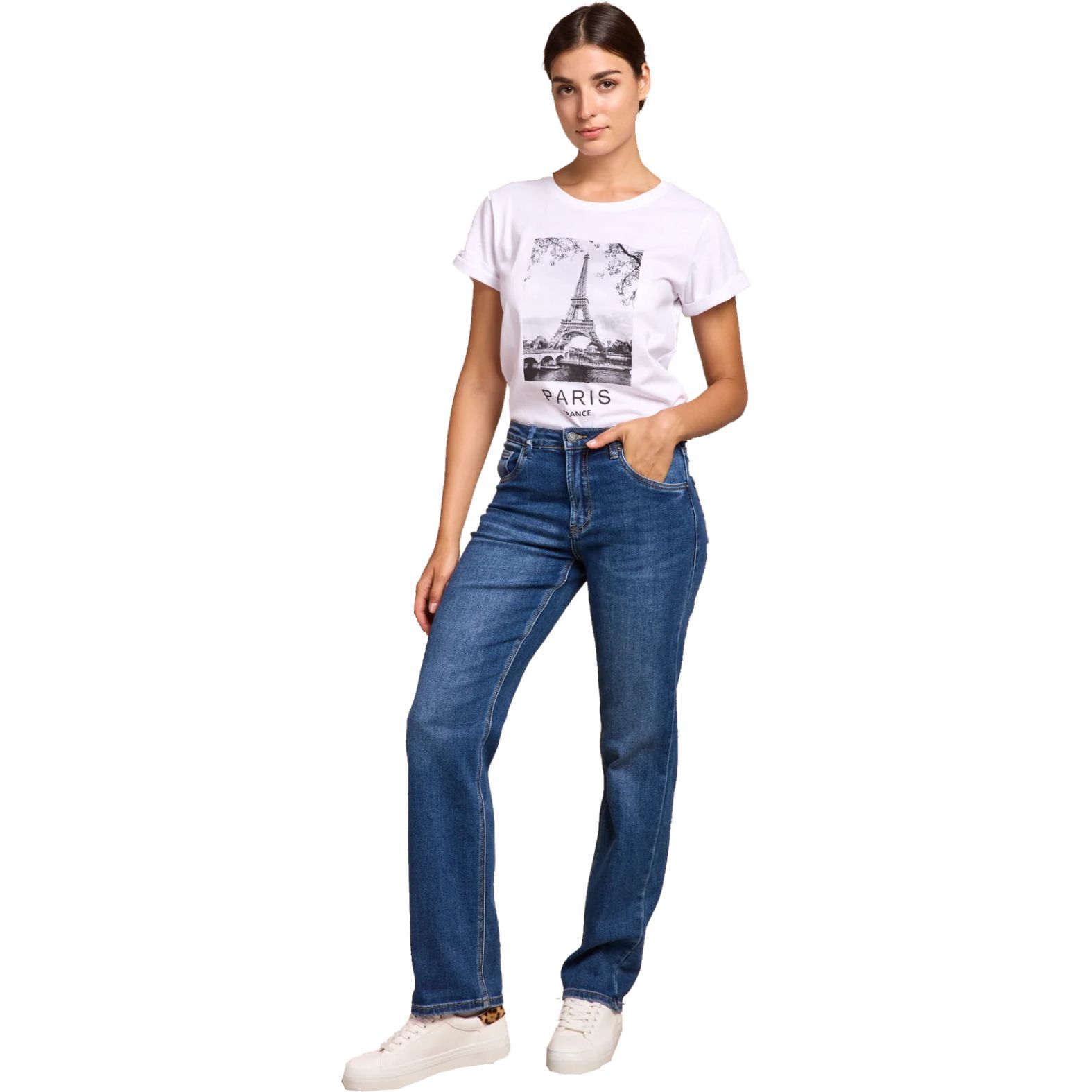 Egyedi kialakítású trendi egyenes szárú női farmer nadrág a francia Toxik3 Denim prezentációjában.