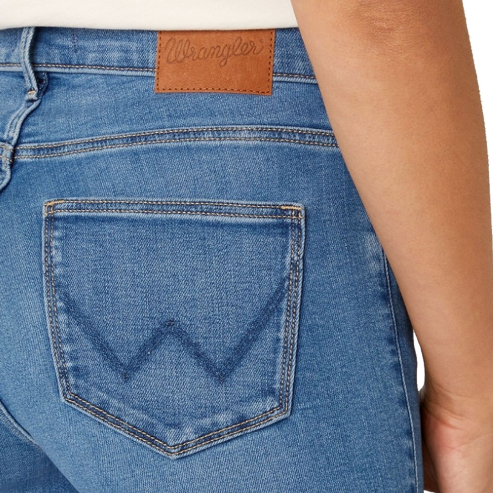 A letisztult Wrangler® Straight 4W DBR Anabel W26RCY37Q különleges világoskék árnyalatát enyhe rodeó-koptatások, narancssárga tűzések és a védjeggyé vált "W" tűzésű hátsózsebek, valamint az eredetiséget igazoló bőr logó teszi karakteressé és jól megkülönböztethetővé.
