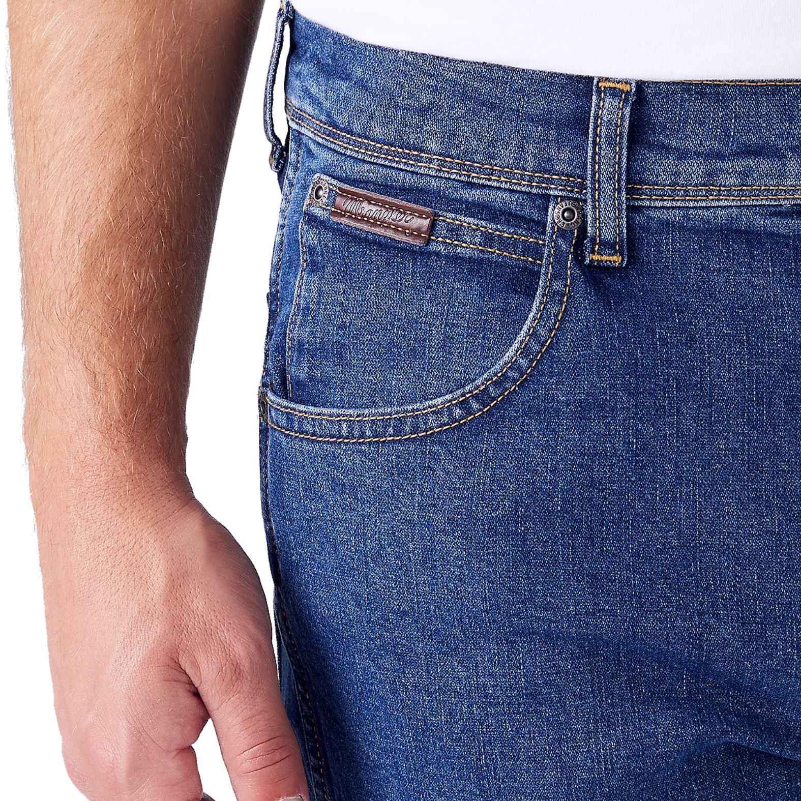 A letisztult Wrangler® Texas 821 MB Stretch Authentic Straight Best Rocks W121HR36B koptatásmentes középkék avatással, narancssárga tűzésekkel a védjeggyé vált "W" hátsózsebekkel, valamint az eredetiséget igazoló bőr logóval készült.
