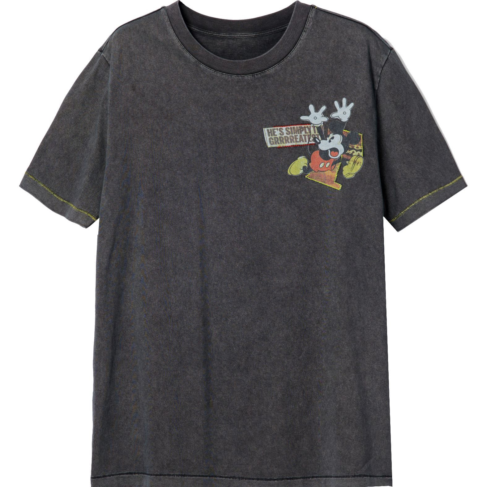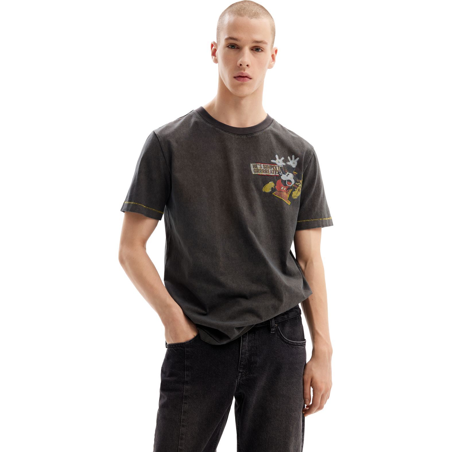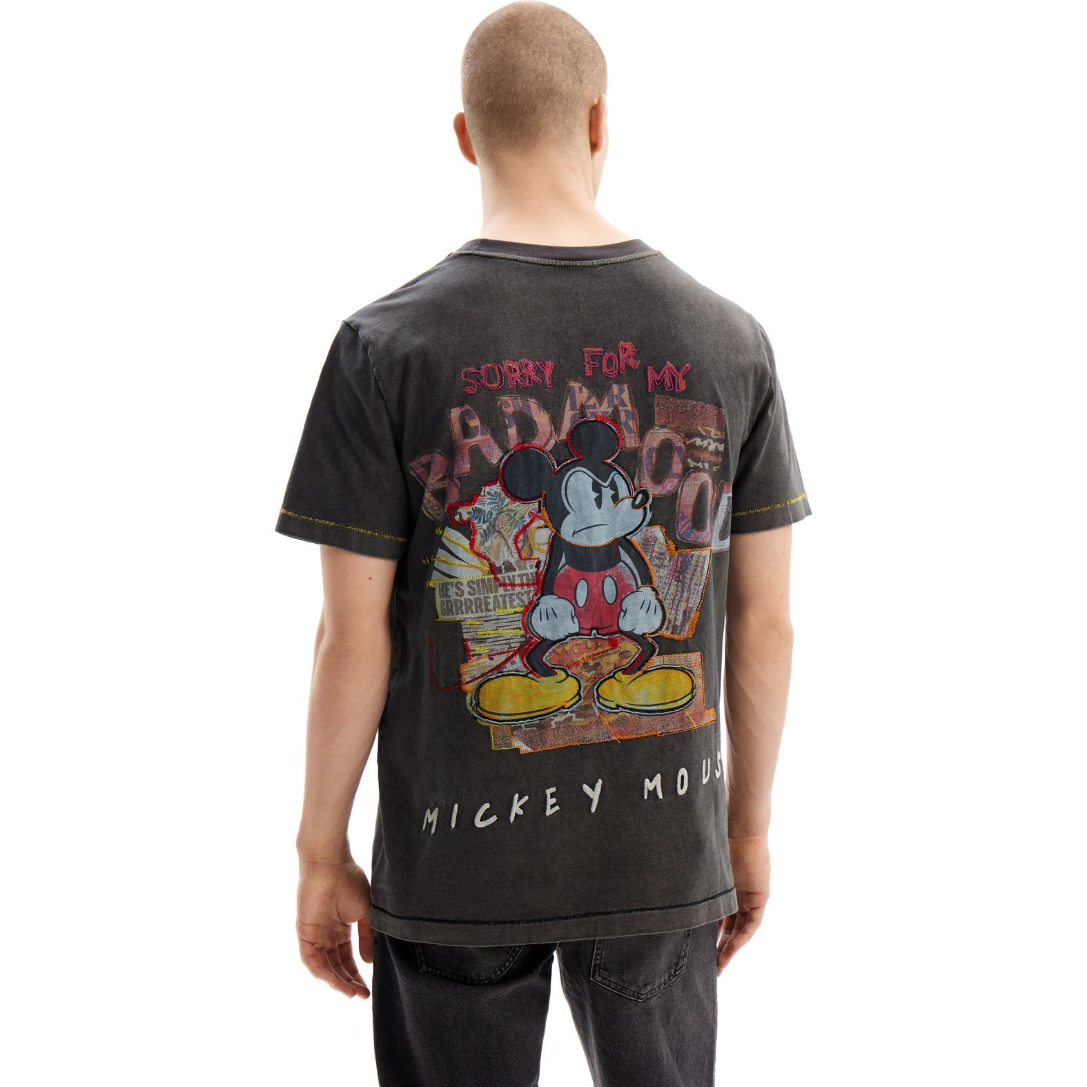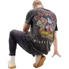 Rövid ujjú póló koptatott hatással, Disney Mickey egér kollázs hatású mintával és hímzett részletekkel.