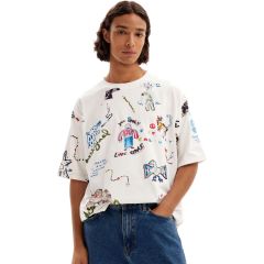 Klasszikus fazonú rövid ujjú póló többszínű mintával, feliratokkal és hímzett részletekkel.