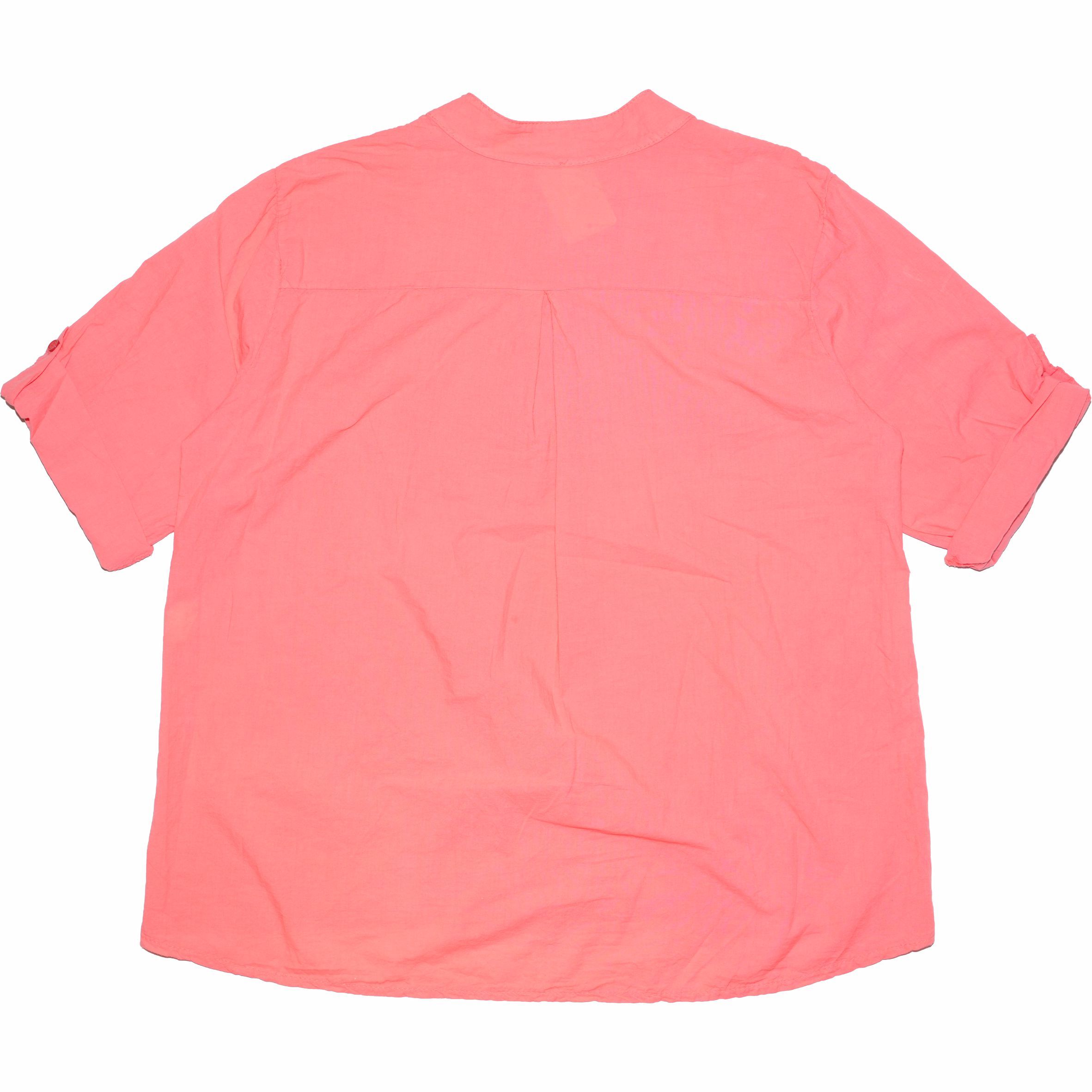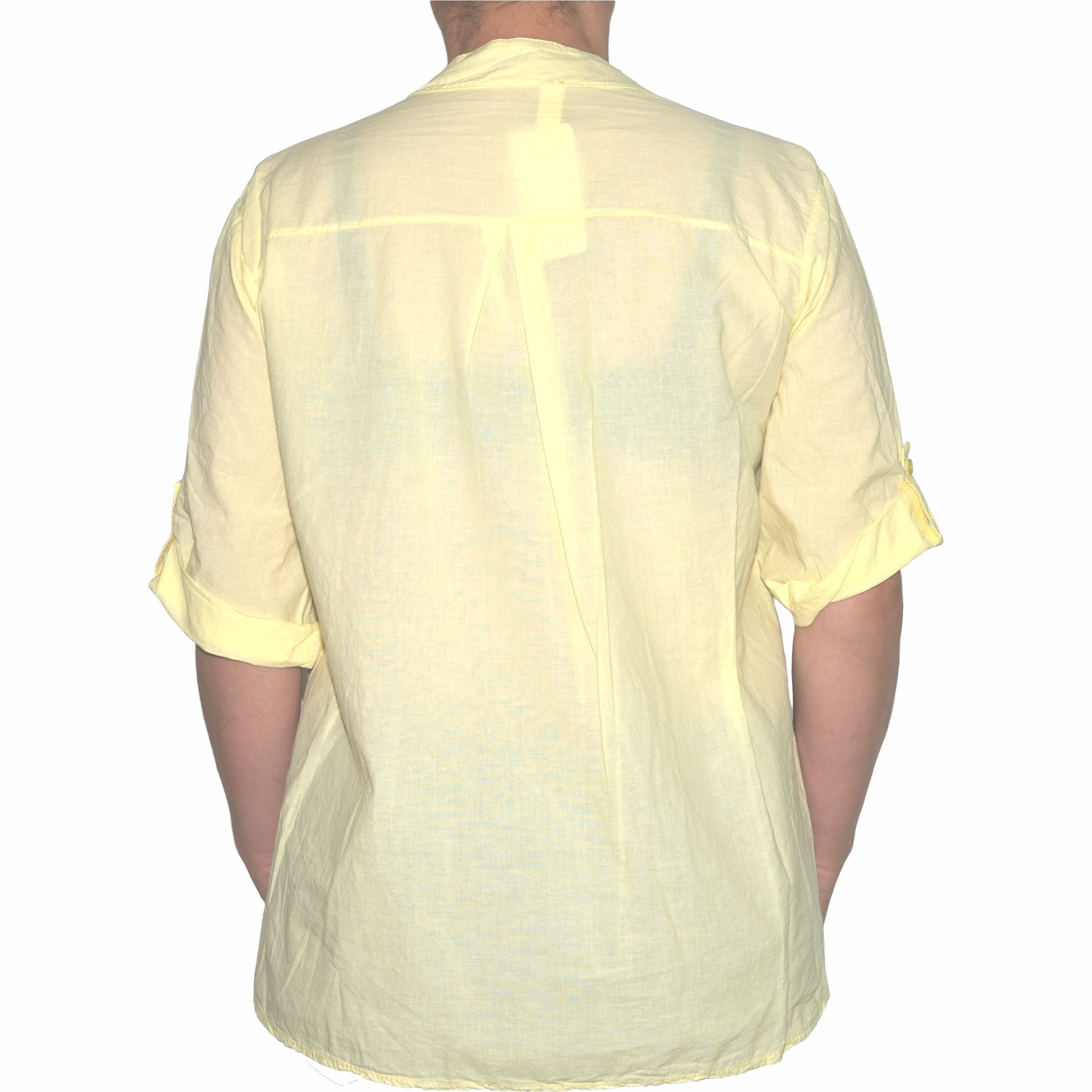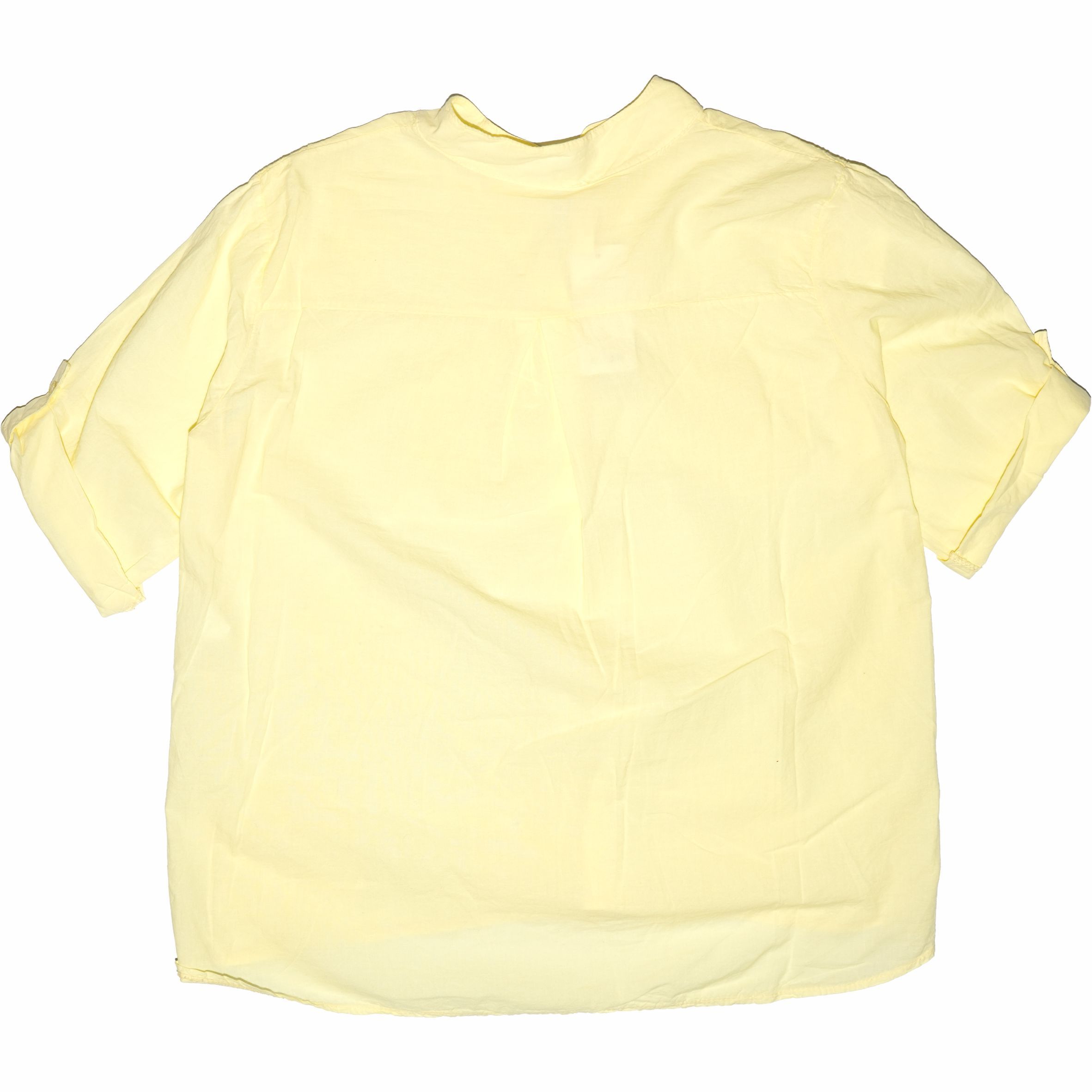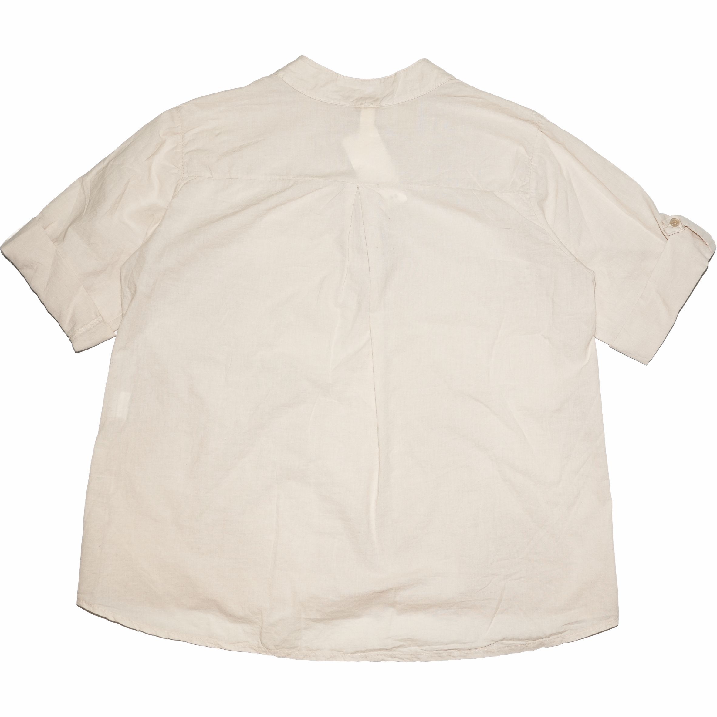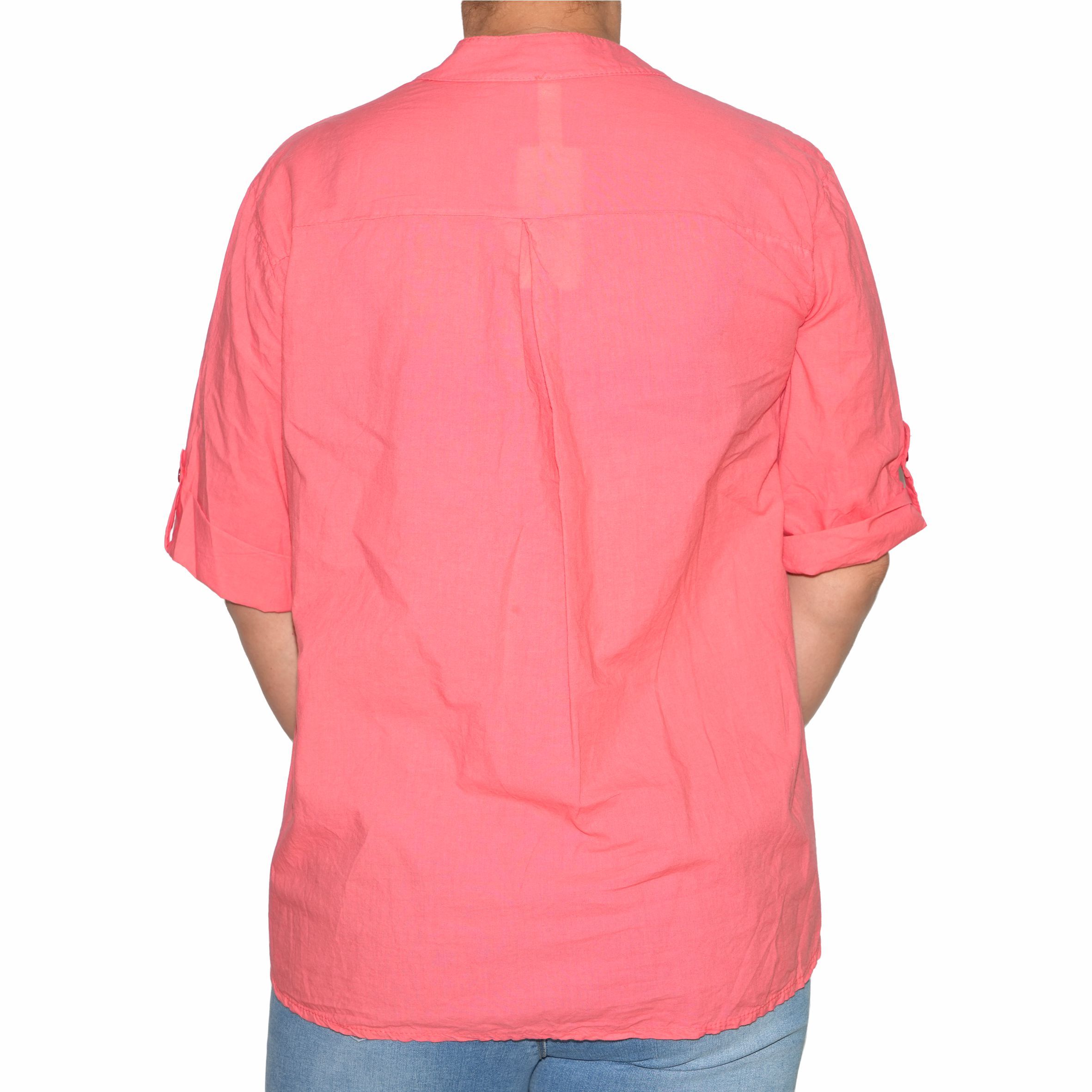 Gombos nyakú, gombbal rögzíthető félhosszú ujjú női felső.