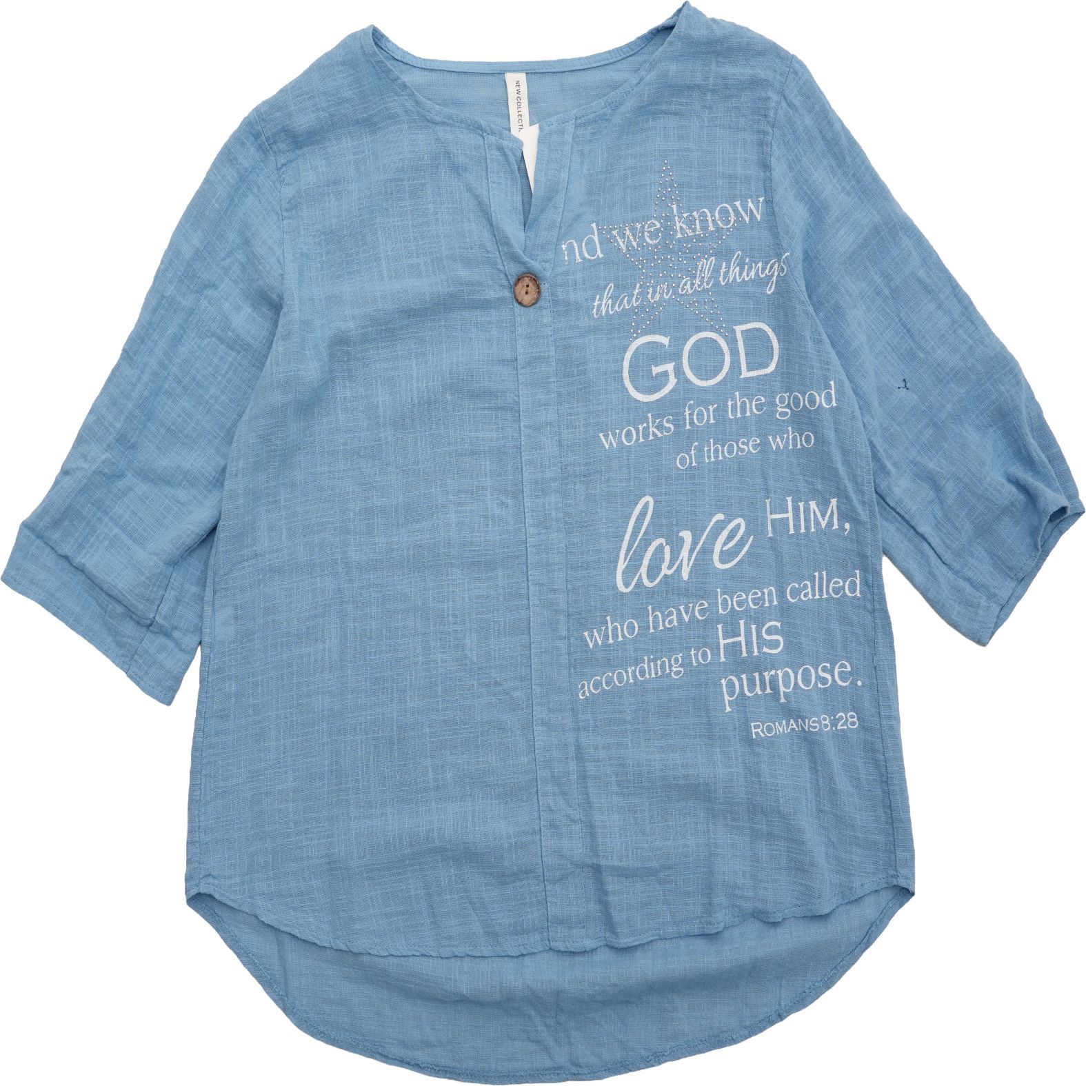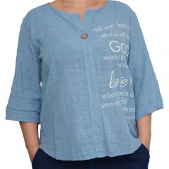 Világoskék árnyalata friss, nyárias hangulatot ad megjelenésének, míg az elöl elhelyezett dekoratív felirat és az egyedi gombos nyakrész különleges karaktert kölcsönöz a felsőnek.