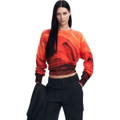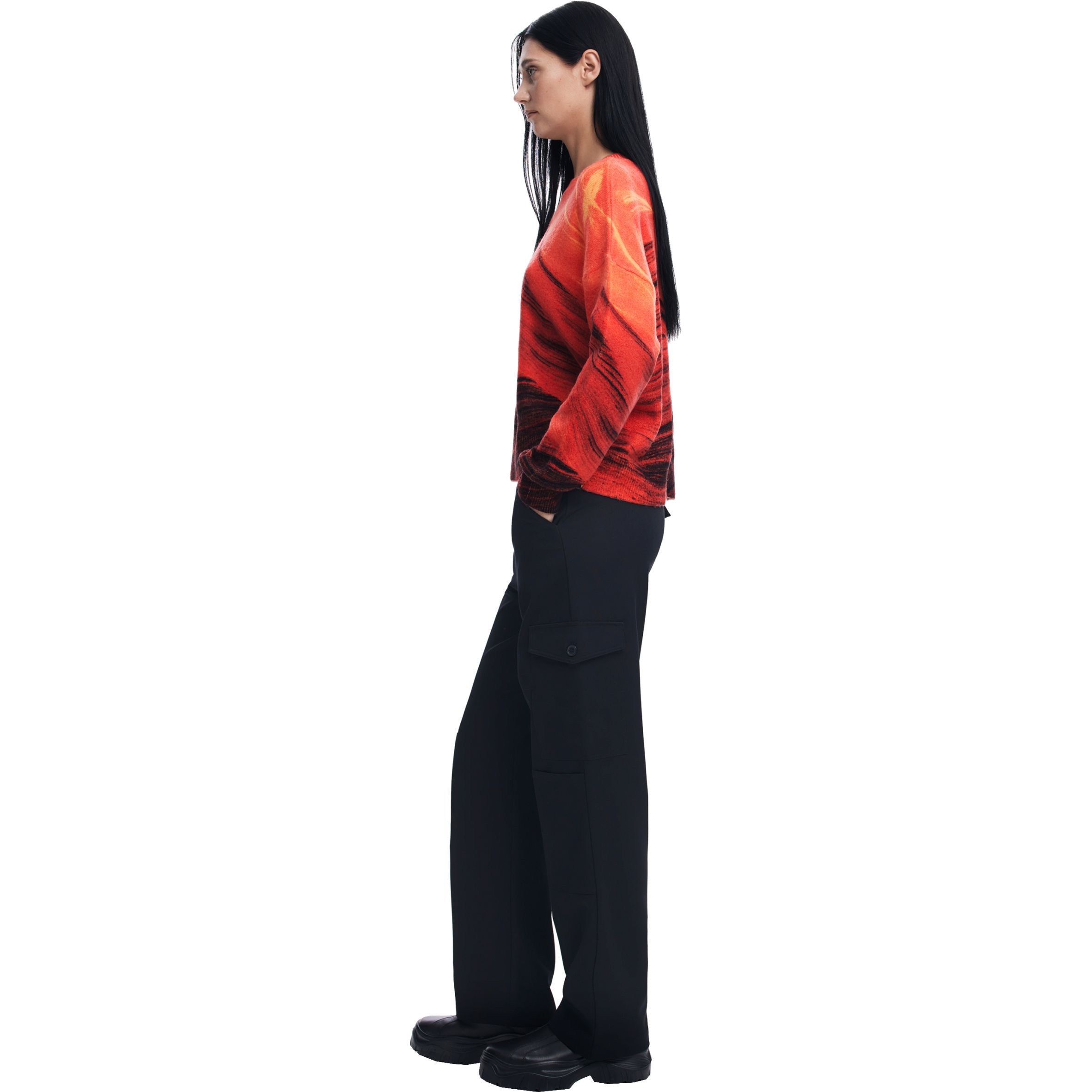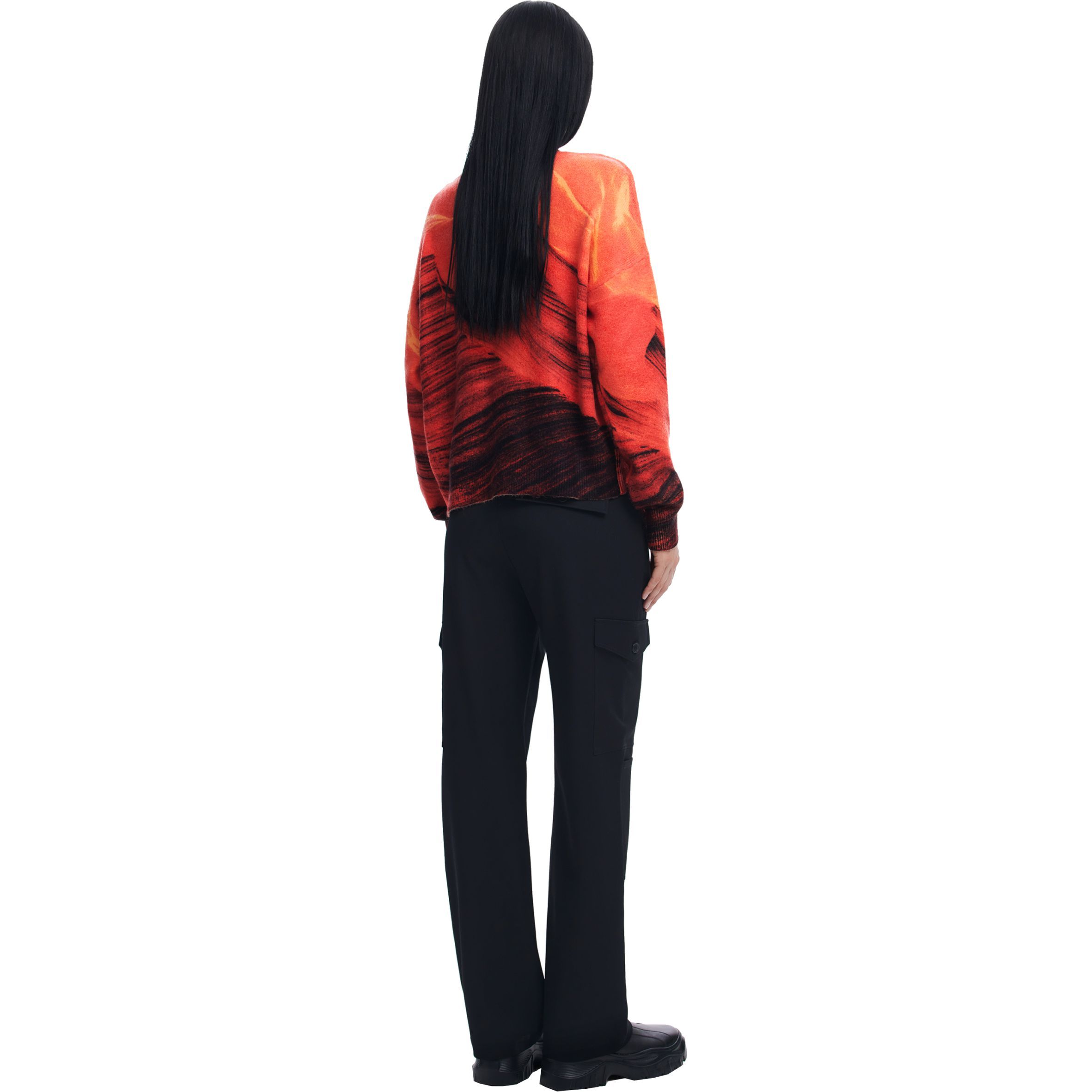 Hosszú ujjú, környakas, kötött pulóver különböző vörös-sárga és fekete árnyalattal, absztrakt mintával.