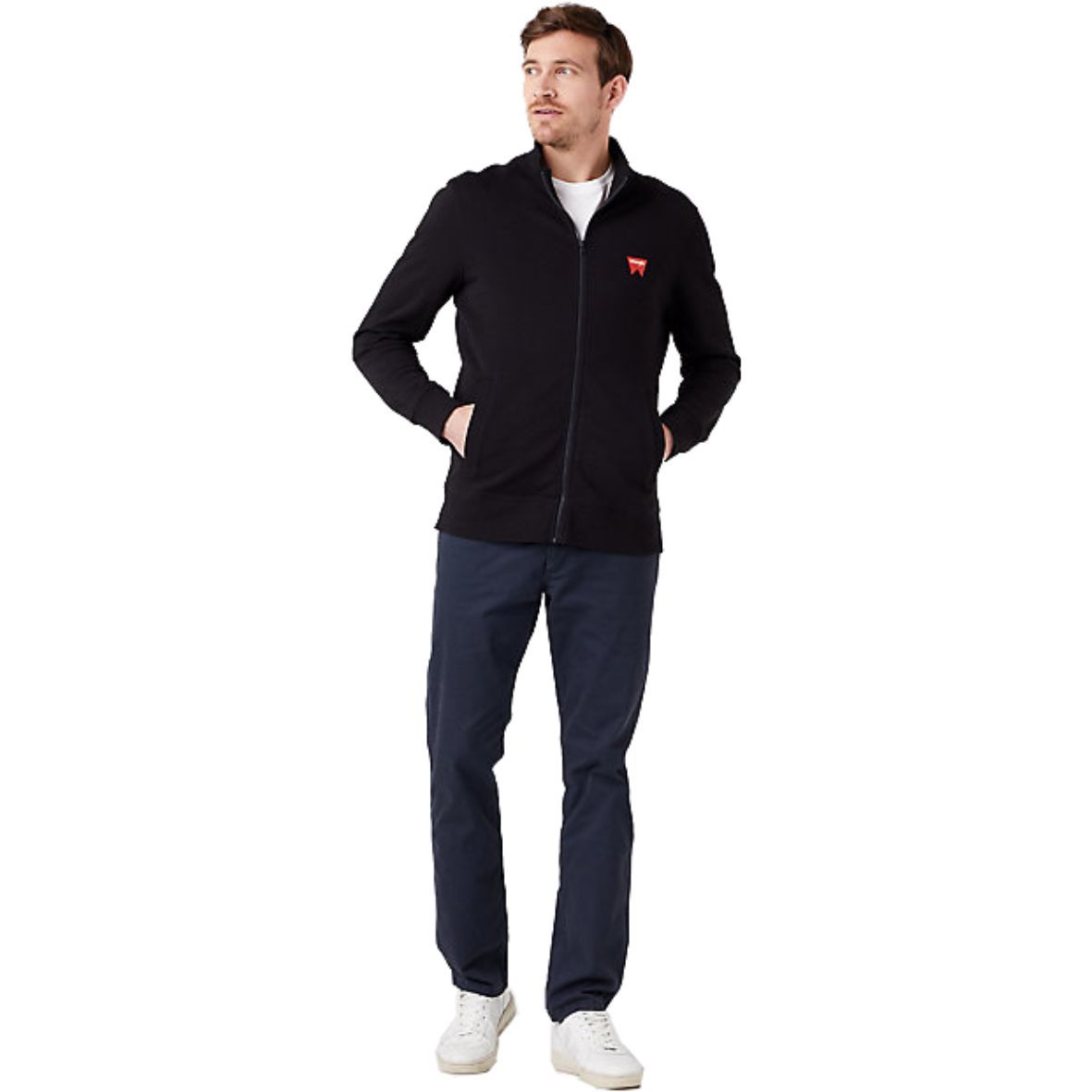 A letisztult Wrangler® Funnel Neck Sweatshirt Black Zip W663HA100 egységesen fekete színű. Baloldalán elöl a védjeggyé vált "W" piros sziluettje és a márkanév teszi markánssá.