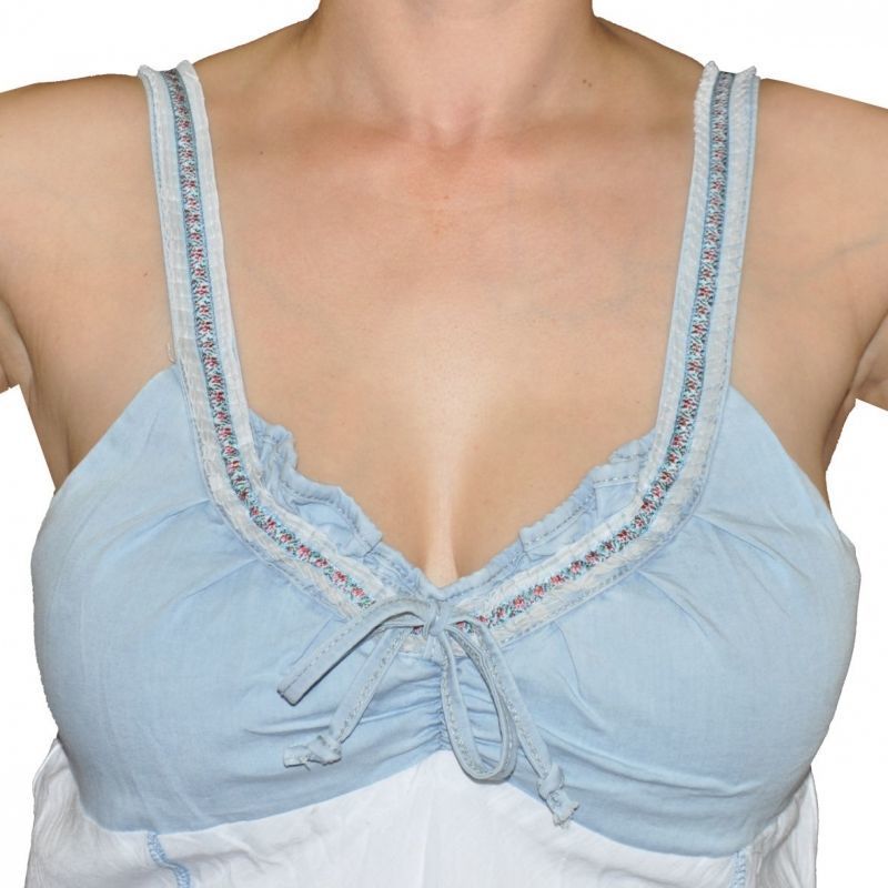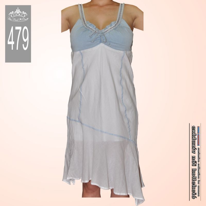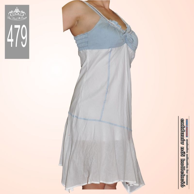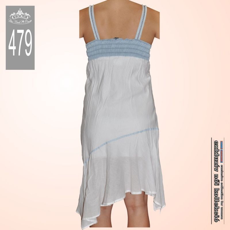 Különleges, egyedi fazonú loknis farmerruha. Alapanyaga 100% biopamut, felső része világoskék, vékony farmeranyag, alsó része hófehér vászon. Felül gumírozott, masnival díszített dekoltázzsal, lefelé bővülő függőleges és ferde fedőzött díszítésű szabásvonalakkal, ami által oldalain kissé hosszabb, középen rövidebb. Hátul a széles gumírozás biztosítja a kényelmes és szexi megjelenést. Pántja 2 cm széles, egyedi, rakott és hímzett szalaggal, amely a ruha hátsó részénél varrással méretre igazítható.