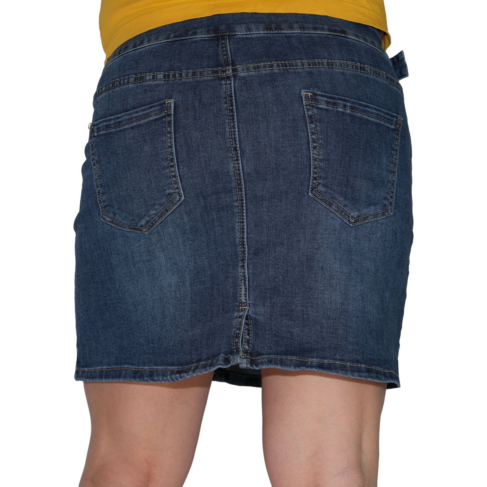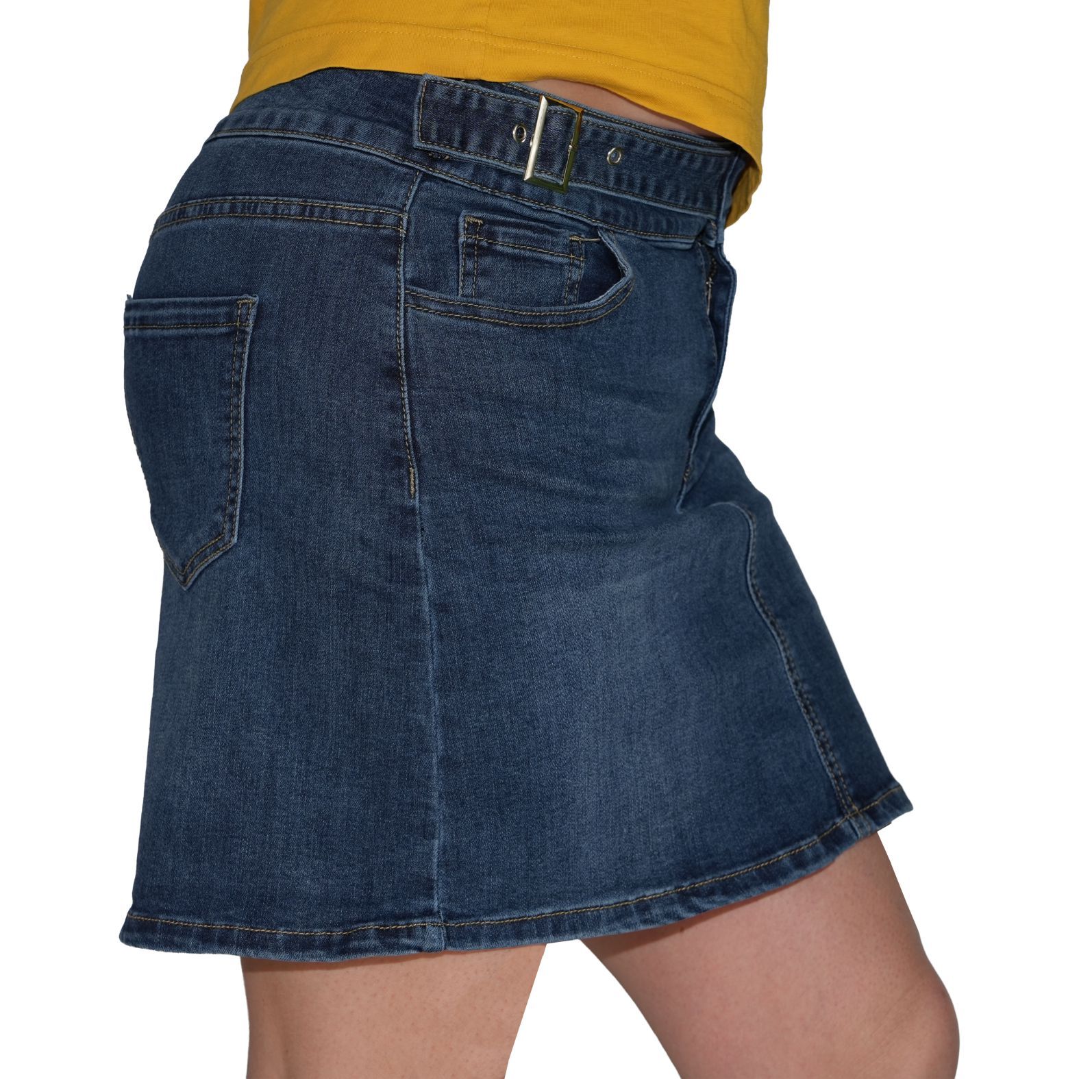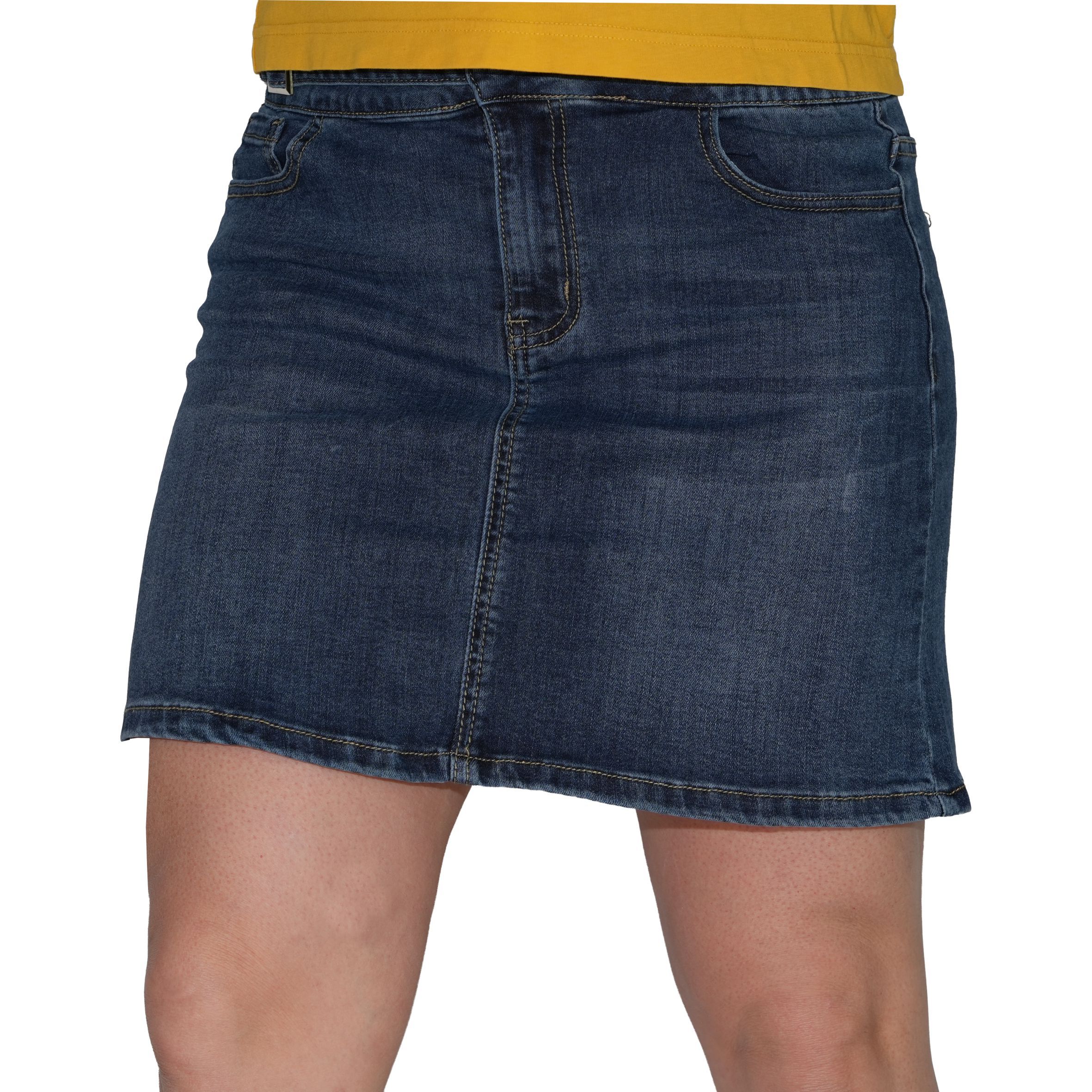 Trendi derékpánttal és különlegesen rugalmas alapanyagból készült általában térd felett érő farmerszoknya.