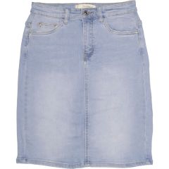 Különlegesen rugalmas alapanyagú térdig érő farmerszoknya.